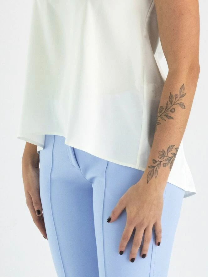 Un top de High en blanc crème. Le top a un col rond et une légère forme en A. Le devant est mat et l’arrière est en satin mat. Ce top peut être lavé à la main.