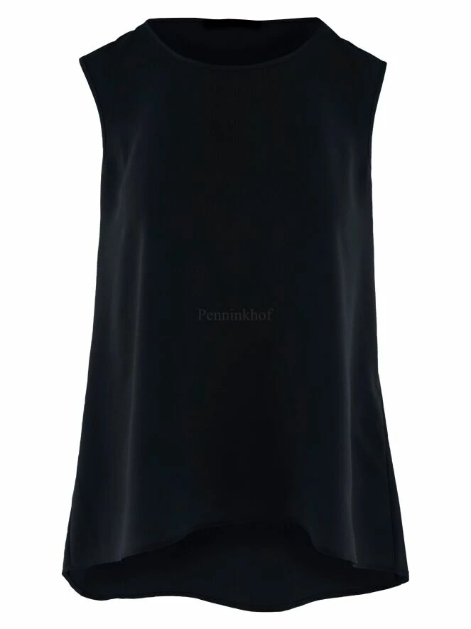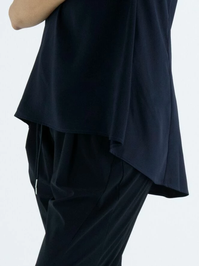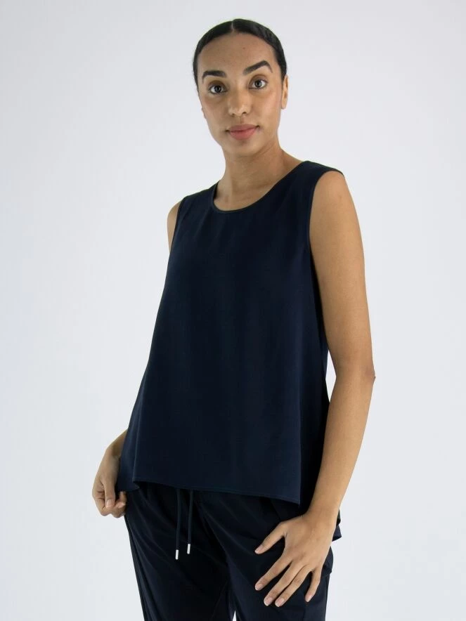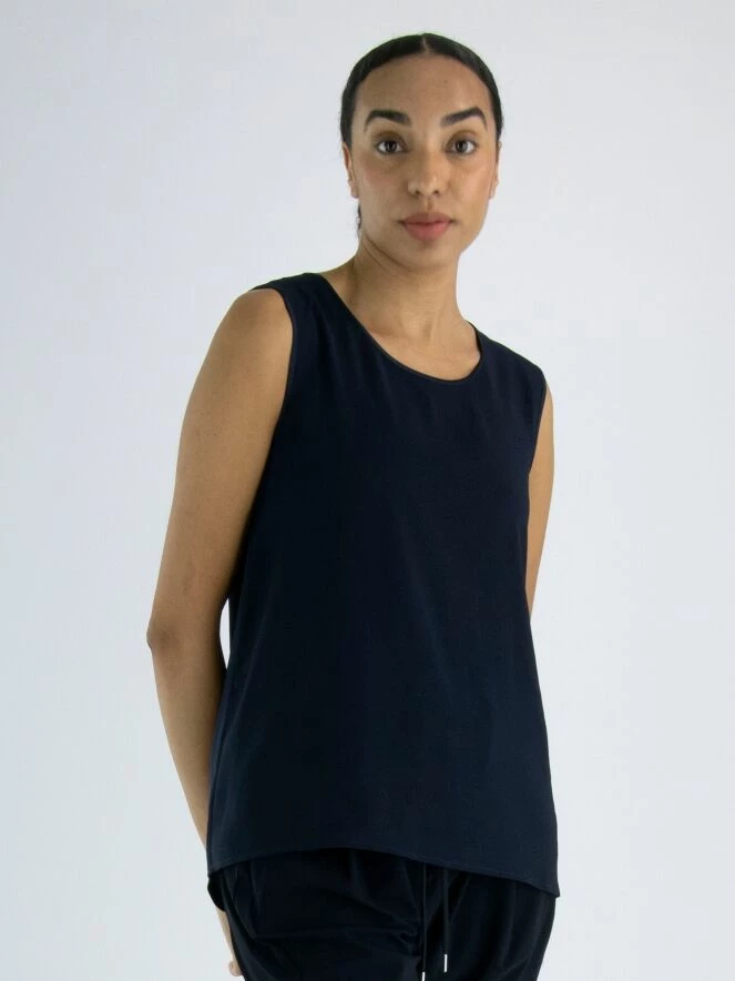 Un top de High en bleu marine. Le top a un col rond et une légère forme en A. Le devant est mat et l’arrière est en satin mat. Ce top peut être lavé à la main.