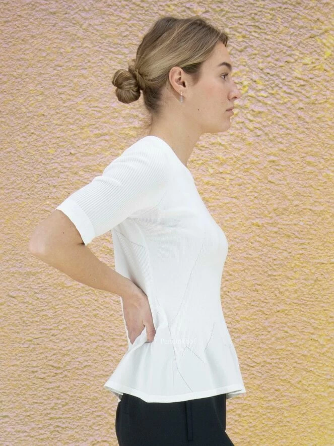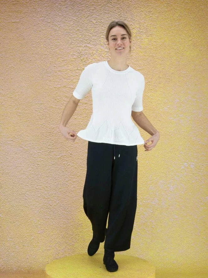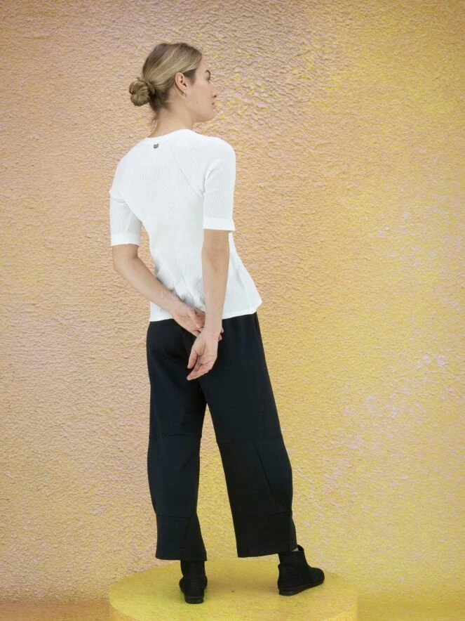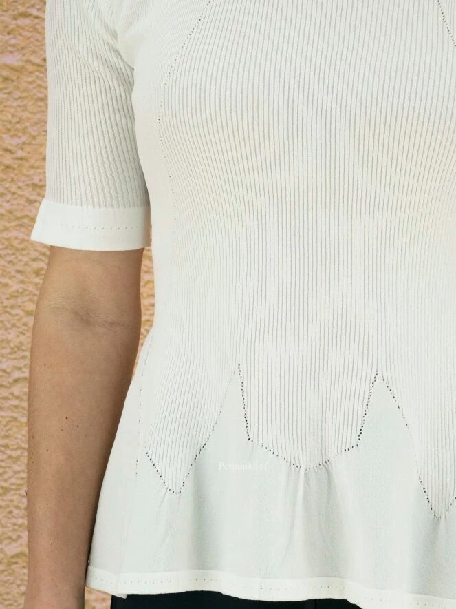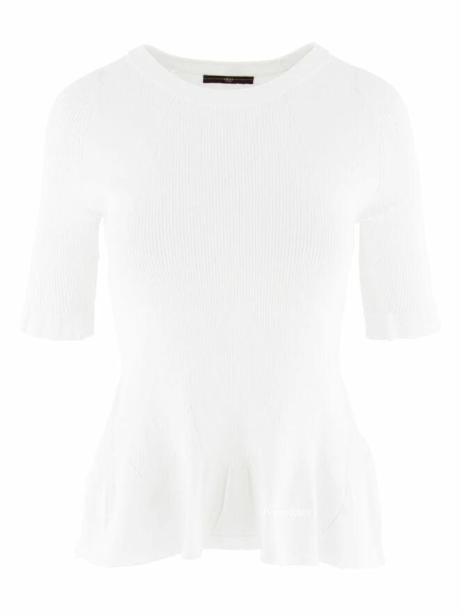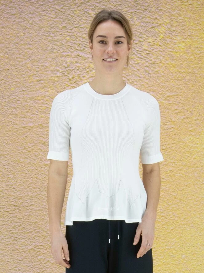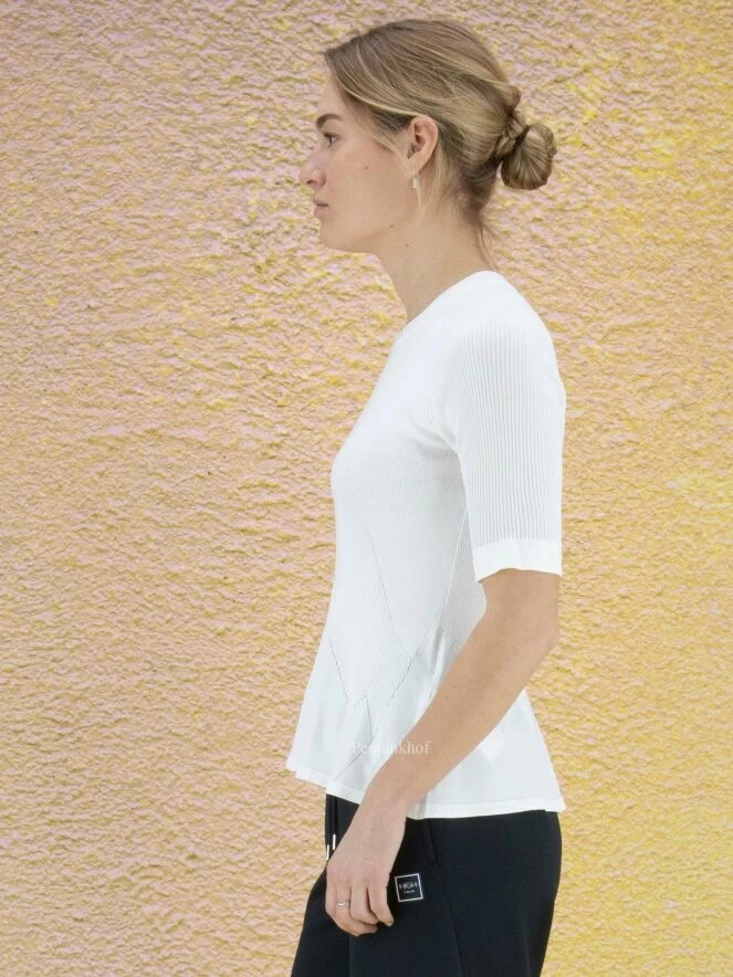 Tee-shirt à manches courtes raglan de la marque High, dans une structure finement côtelée de couleur blanche. Le tee-shirt s’évase légèrement vers le bas dans un tissu uni sous des coutures en zig-zag. Lavage à la main.