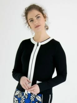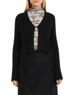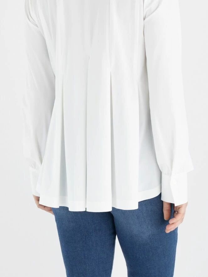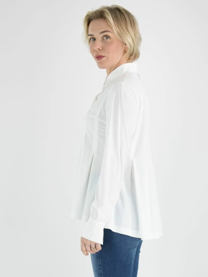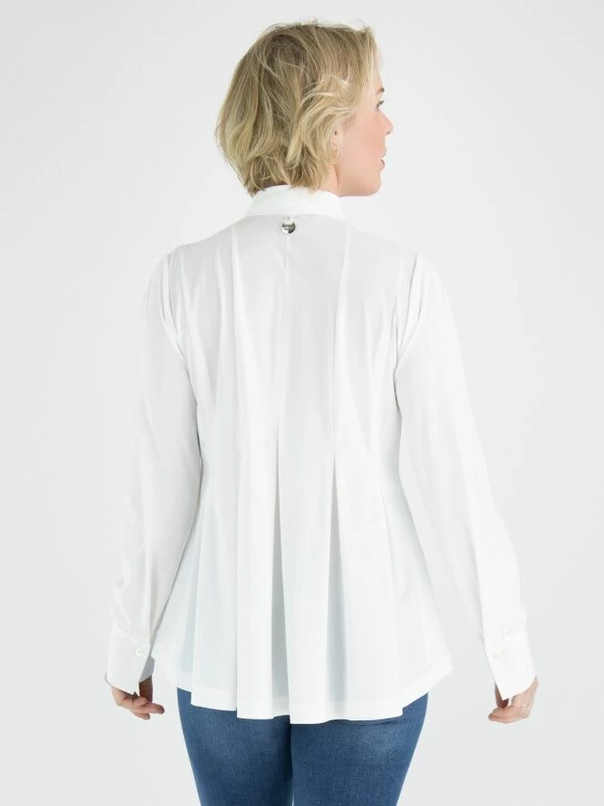 Un cardigan ou une blouse de High en blanc. À partir de la taille, il y a plusieurs plis ceinture, donnant au cardigan une forme en A à partir de la taille. Ce cardigan peut être lavé à la main.