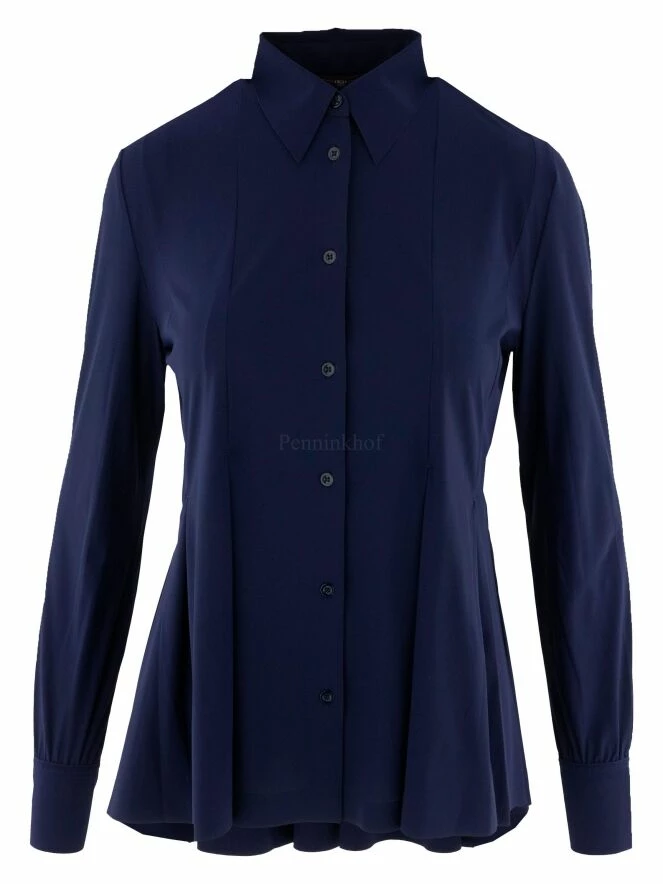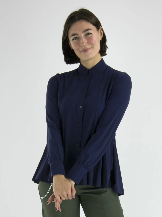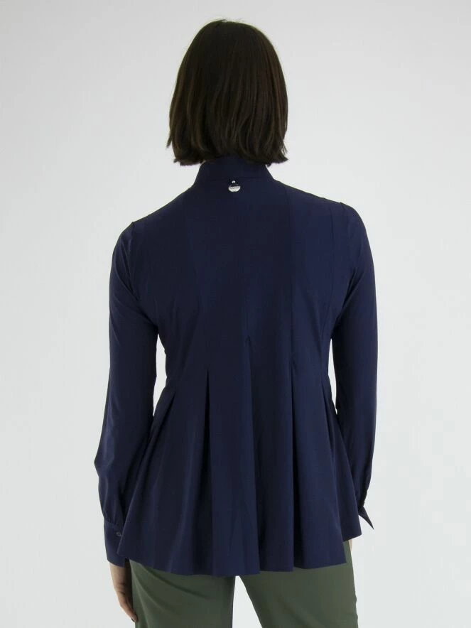 Un gilet ou une blouse de High en bleu nuit. Depuis la taille, il y a plusieurs plis pincés, donnant au gilet une forme en A à partir de la taille. Ce gilet peut être lavé à la main.