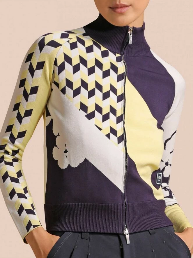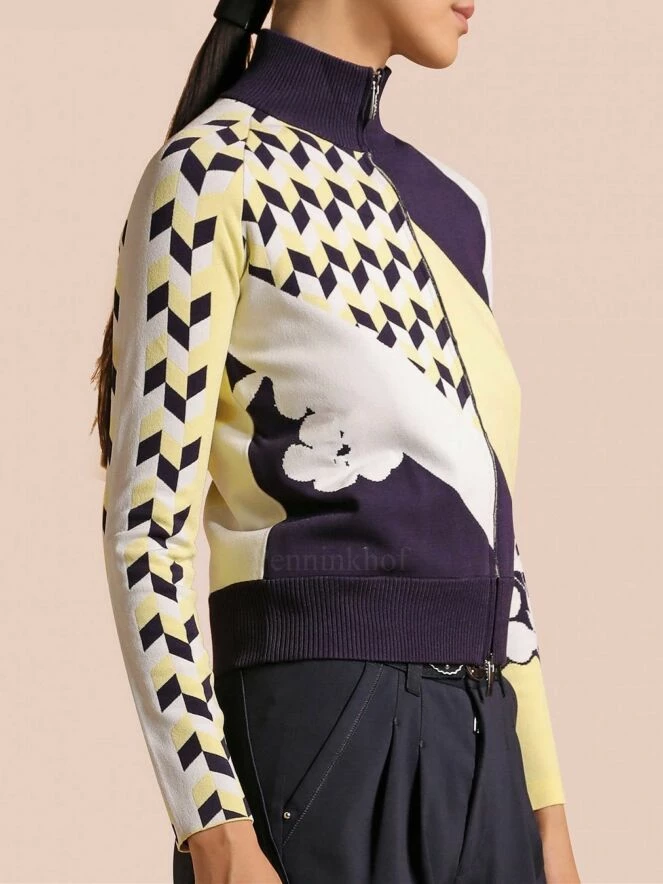 Cardigan à col haut, de la marque High, à imprimé graphique asymétrique aux couleurs jaune clair, blanc et bleu marine. Le col et le bas du gilet sont en tricot finement côtelé. Le cardigan est doté de manches raglan, l’une avec un motif de chevrons et l’autre avec un motif floral abstrait. Il est équipé d’une fermeture Eclair à double curseur. Lavage à la main.