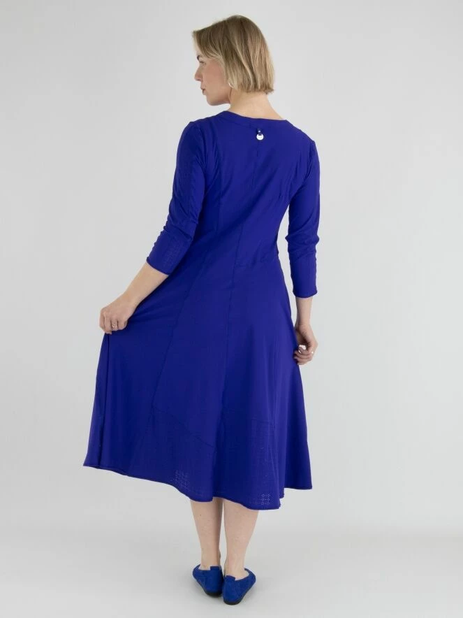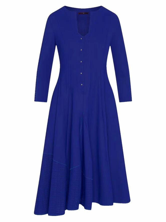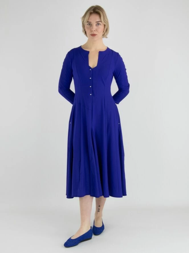 Une robe de la marque High en bleu cobalt. Au centre de l’encolure ronde, il y a une découpe jusqu’à la poitrine. À partir de la poitrine, il y a des boutons-pression avec des clous ronds en argent jusqu’à la taille. La robe a une silhouette évasée à partir de la taille. Il y a des poches au niveau de la taille et la robe a des manches mi-longues. Cette robe doit être lavée à la main.
