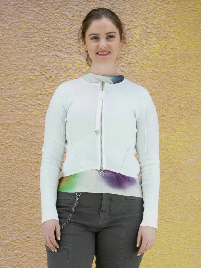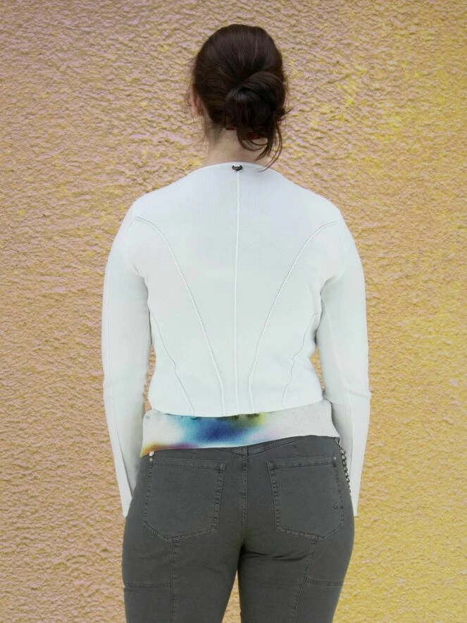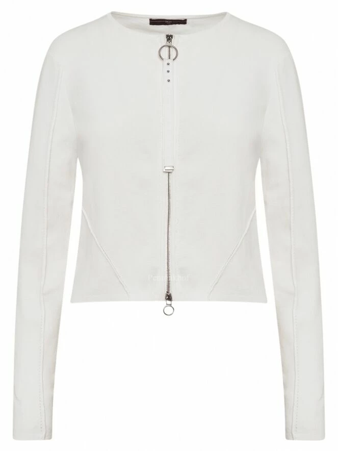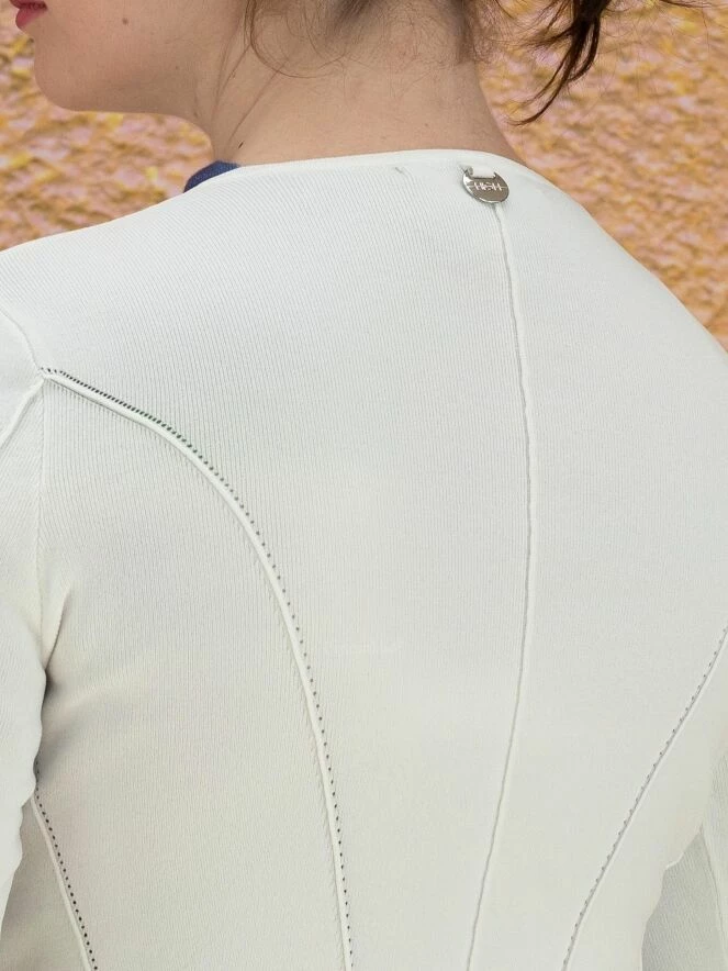Gilet court à col rond de la marque High, de couleur blanche. Le cardigan est équipé d’une fermeture Eclair argentée avec une longue tirette en ruban ornée d’extrémités argentées. Des coutures en relief ornent les manches et la partie basse du gilet. Lavage à la main.