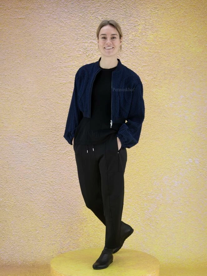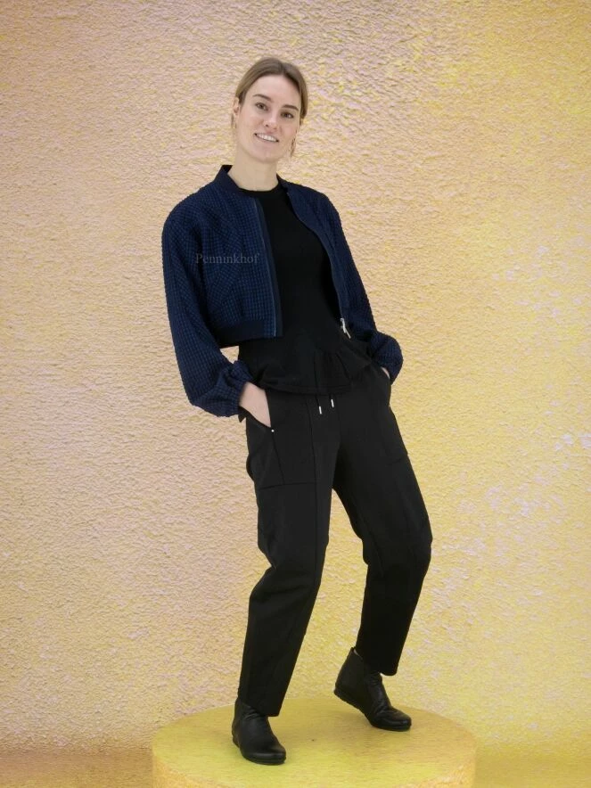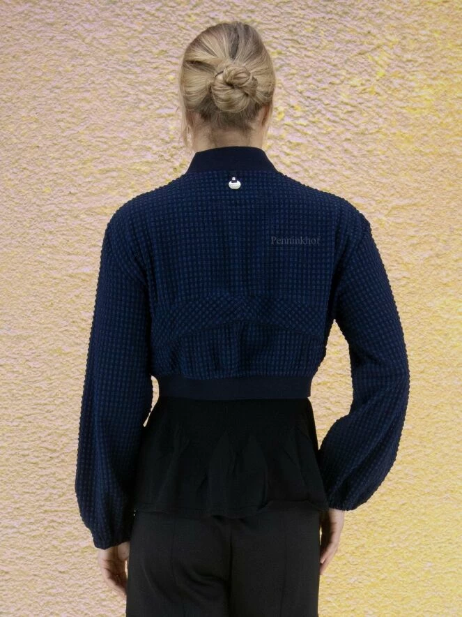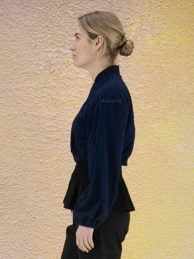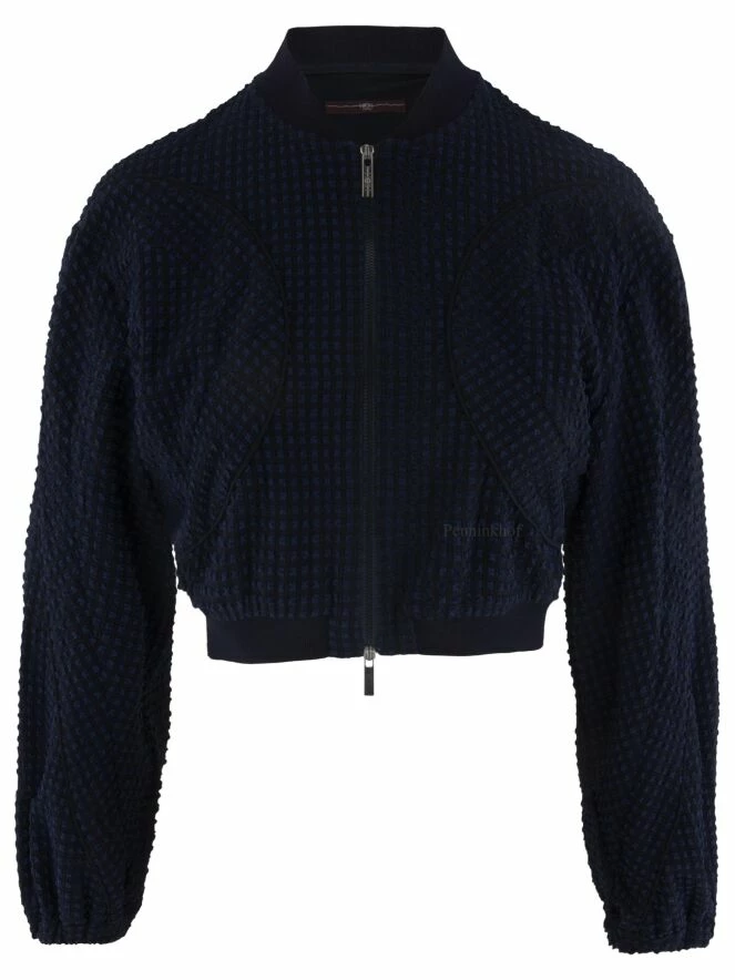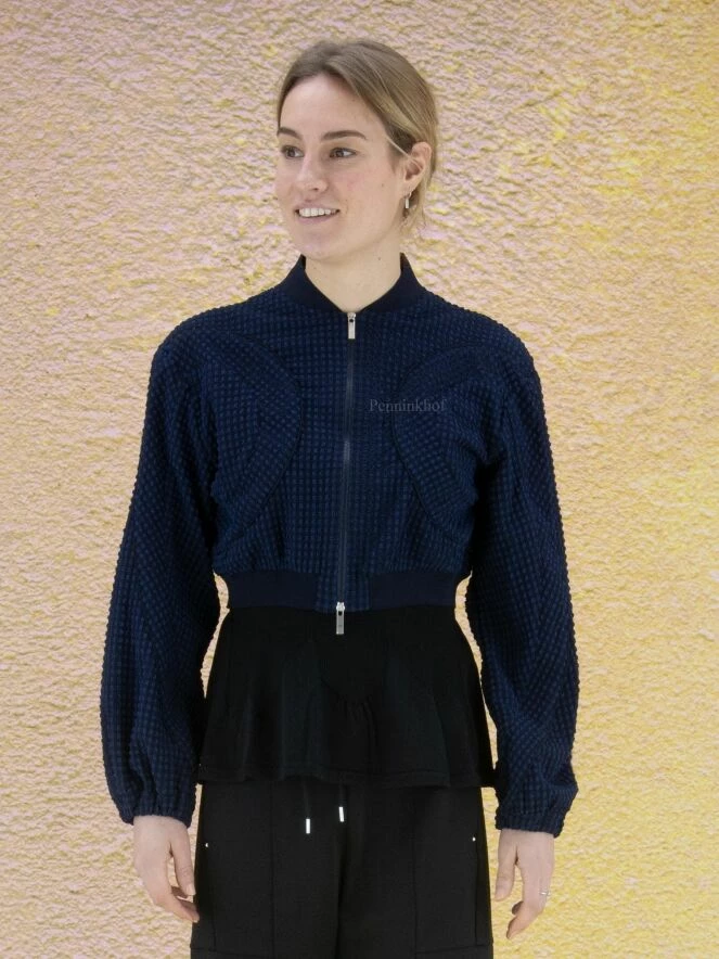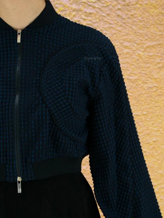 Blouson style aviateur de la marque High, en seersucker aux couleurs bleu nuit. Le col et l’ourlet du bas sont finement côtelés. L’extrémité des poignets est à bordure élastique. Le blouson ferme à l’aide d’un zip à double curseur. Lavage à la main.
