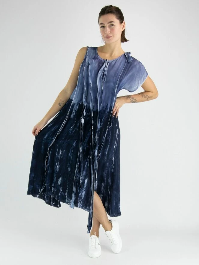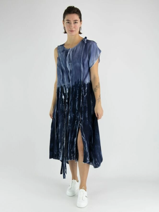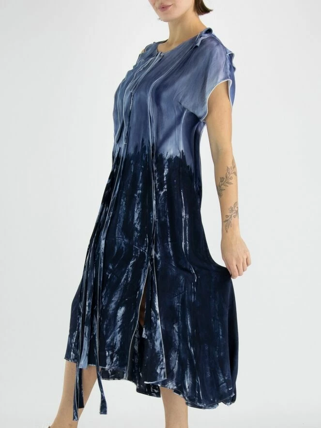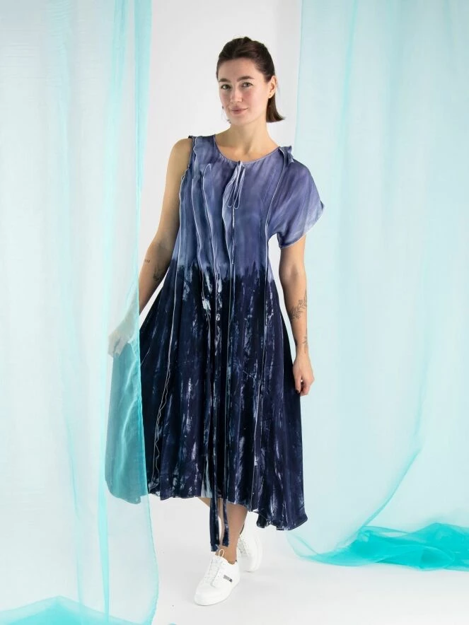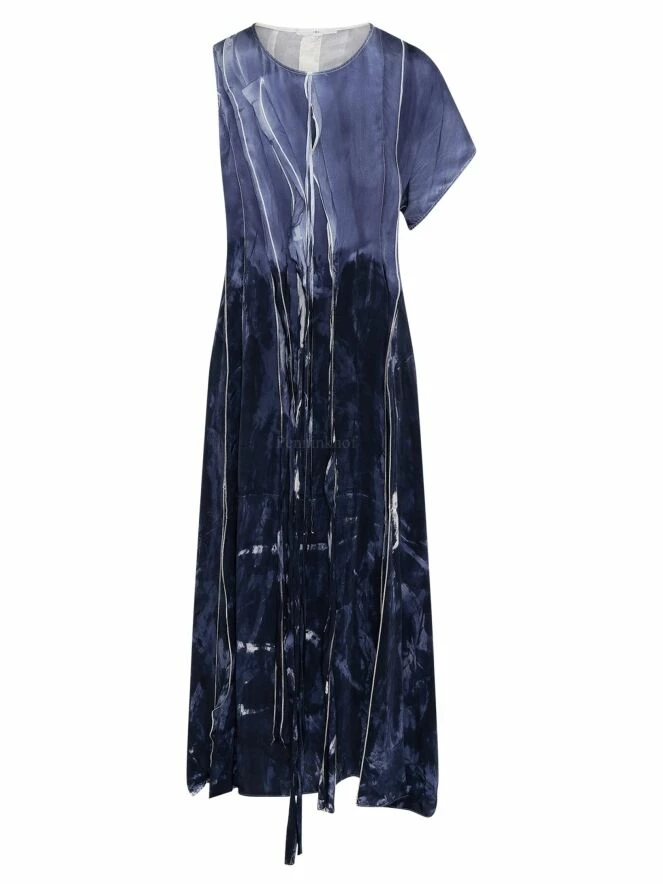 Une robe en satin mat luxueuse de High dans un dégradé de bleu doux à bleu marine. La robe est sans manche sur le côté droit et avec une manche courte sur le côté gauche. À l’avant, il y a plusieurs coutures inversées doubles qui se transforment en rubans de différentes longueurs. À l’arrière, il y a quelques coutures inversées. Au milieu du col rond se trouve un long cordon décoratif. À l’avant, il y a une fente asymétrique jusqu’en dessous du genou. Cette robe peut être lavée à la main.