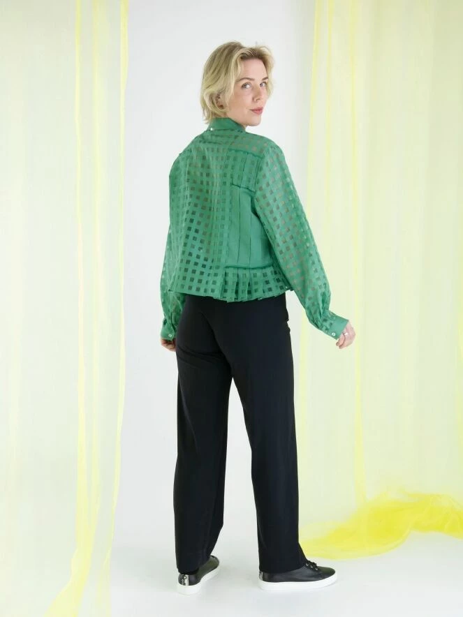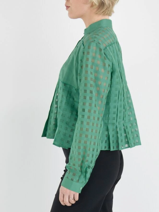Blouse légèrement transparente de High à motifs multiples dans la couleur verte. Ce chemisier ne doit pas être lavé.