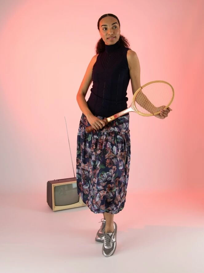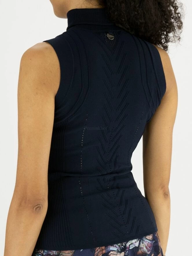 Top sans manches et col roulé de la marque High, de couleur bleu marine. Le top présente de multiples textures en forme de V et quelques perforations ajourées verticales. Les panneaux latéraux sont à maille côtelée. Le dos est identique au devant. Lavage à la main.