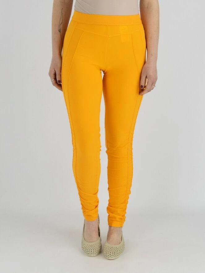 Un legging de High en orange. Il y a une bande élastique à la taille. Le tissu est froncé le long des coutures doubles des jambes. Ce legging peut être lavé à 30 degrés.