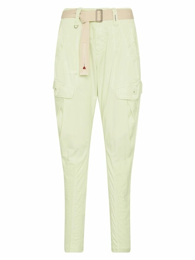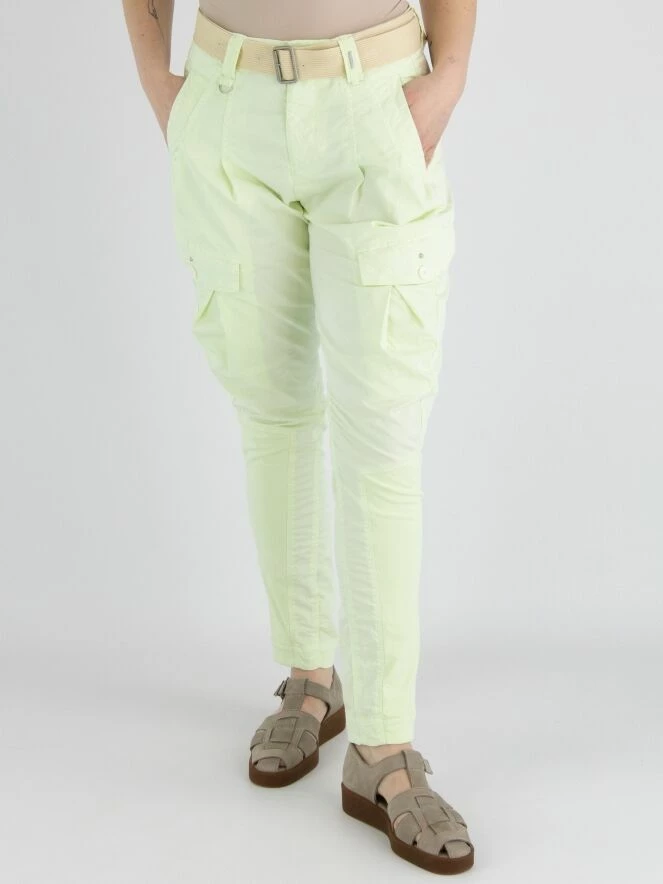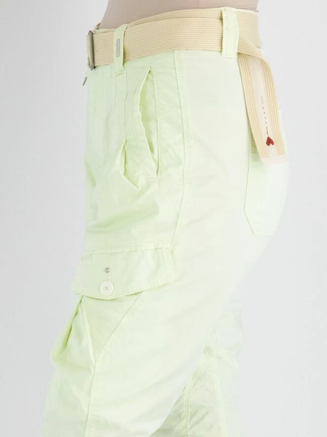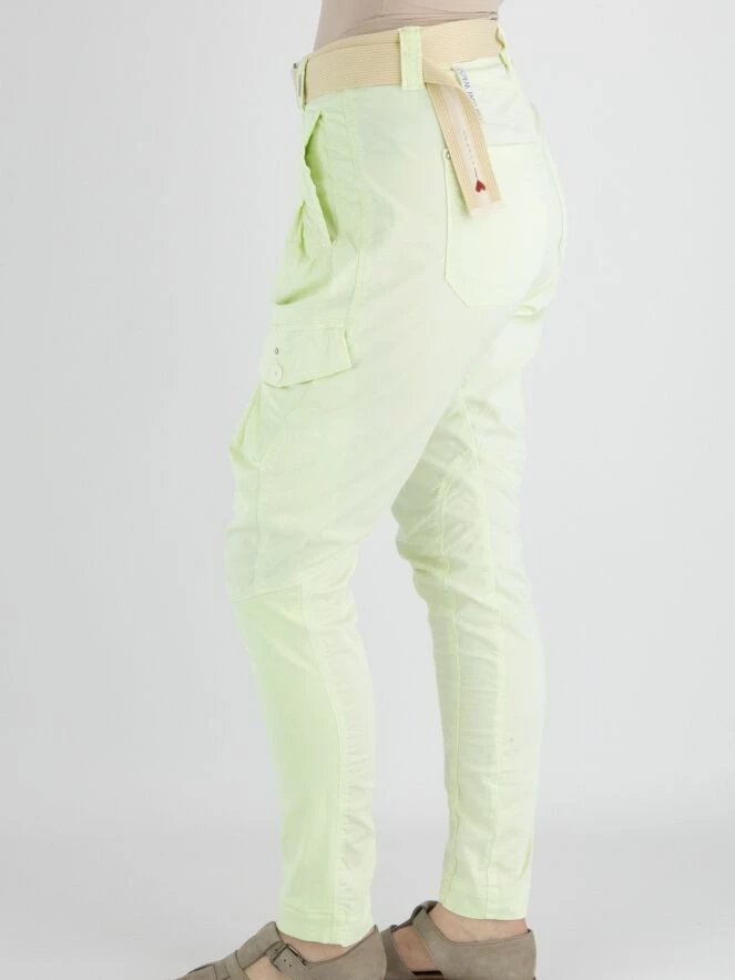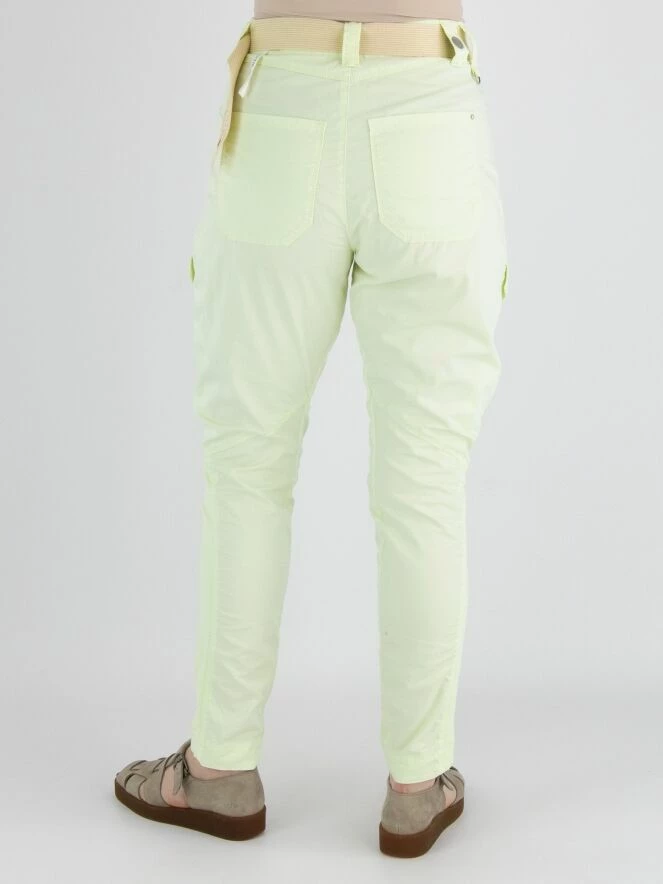 Un pantalon High de couleur jaune citron. Il y a une ceinture en jute de couleur sable clair à la taille. Il y a des poches avec un revers et une fermeture bouton sur la cuisse supérieure. Le bas de la jambe présente une section en tissu doux finement côtelé. Le pantalon a des poches latérales et peut être lavé à 30 degrés.