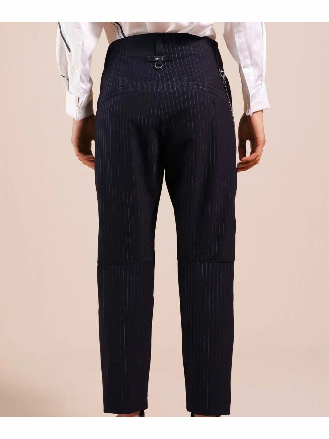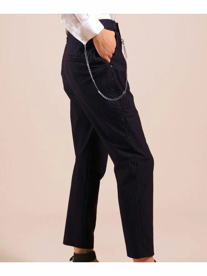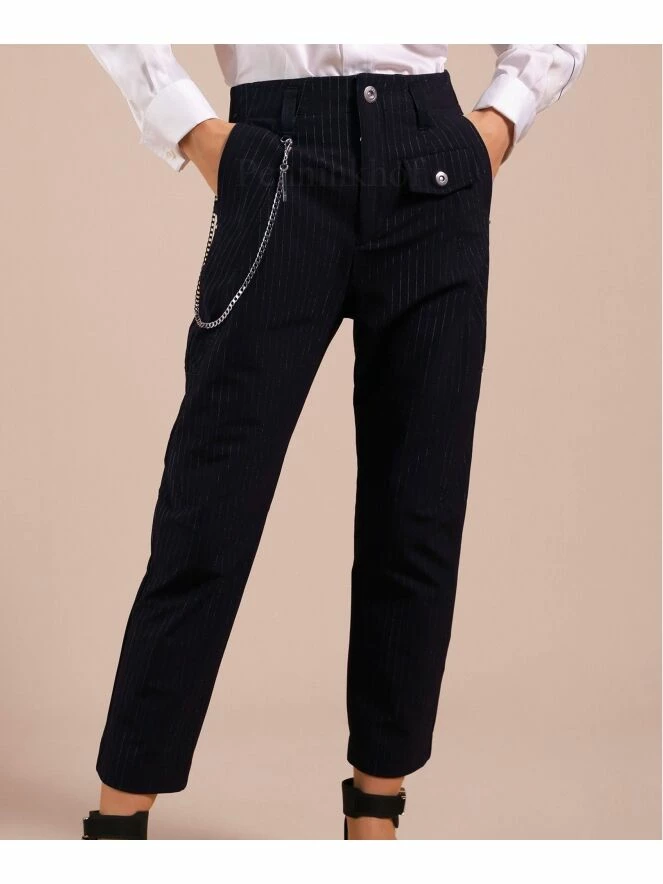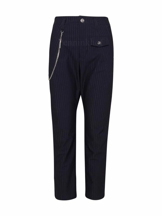 Pantalon de la marque High, à fines rayures de couleurs blanc crème sur un fond bleu marine. La taille est équipée d’une bande élastique cachée. Une poche décorative à rabat boutonné orne le dessous de la taille. Le pantalon est équipé de poches latérales. Une chaîne amovible argentée habille le côté droit. A partir de la taille, une fine surpiqûre blanche en diagonale souligne les poches. Lavage à 30 degrés.