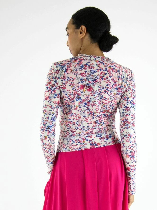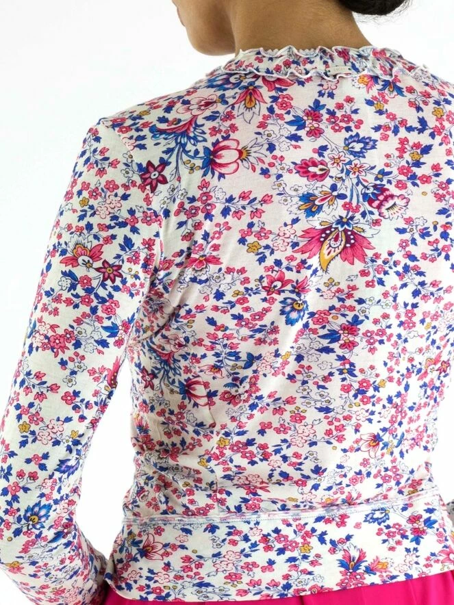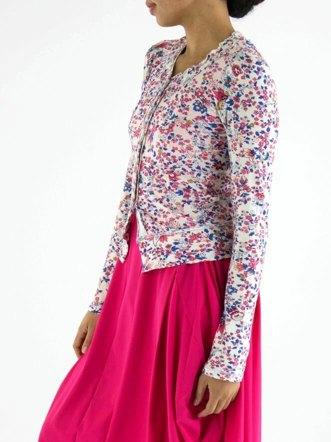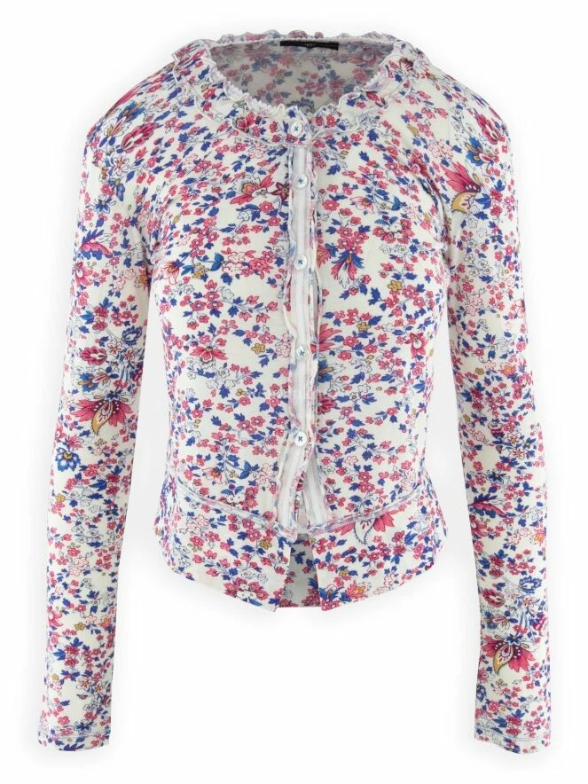 Un cardigan court de High avec un imprimé floral en rouge et bleu sur un fond blanc crème. Le long de la fermeture à boutons se trouve une bordure blanche. Le tissu autour du col rond est double et finement plissé. En bas, il y a une bordure en bleu, rouge et blanc. Ce cardigan peut être lavé à la main.