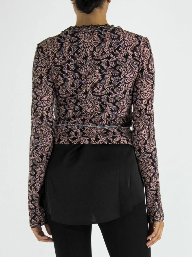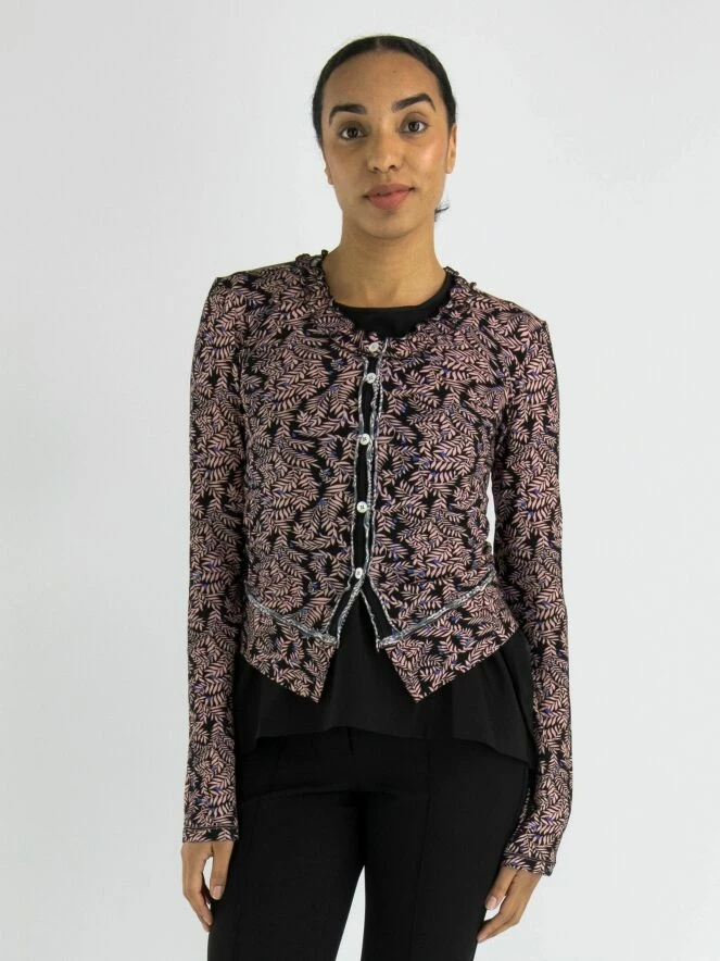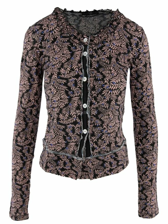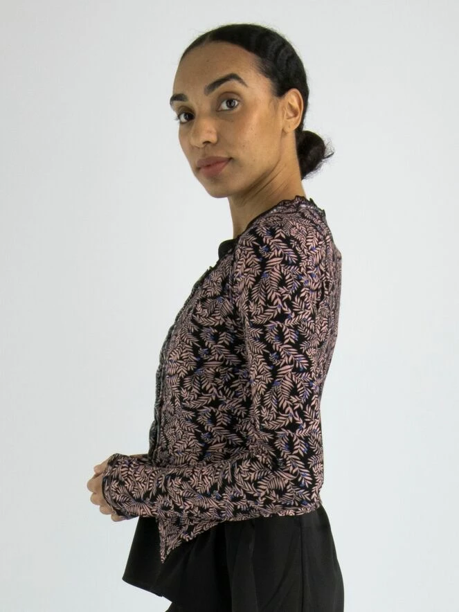 Un cardigan court de High avec un imprimé de fougères en rose et bleu sur un fond noir. Le long de la fermeture à boutons se trouve une bordure noire. Le tissu autour du col rond est double et finement plissé. En bas, il y a une bordure en vert olive et blanc. Ce cardigan peut être lavé à la main.