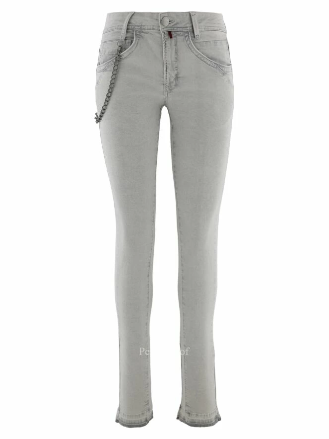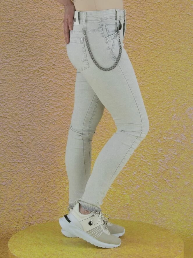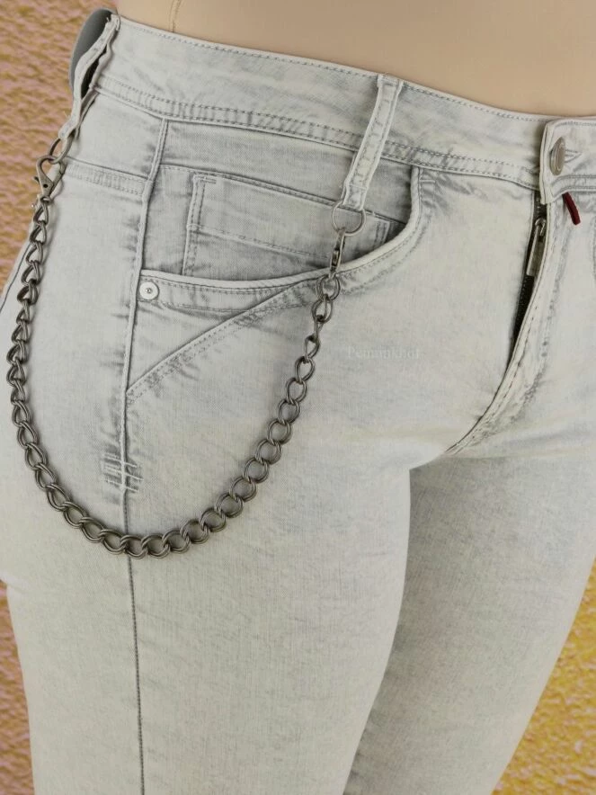 Jean moulant en denim de couleur gris marbré, de la marque High. Modèle à cinq poches. Le jean est équipé d’une double chaîne amovible sur le côté droit. Le bas des jambes est finement frangé. Lavage à 30 degrés.