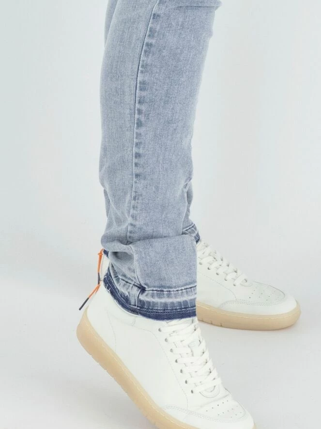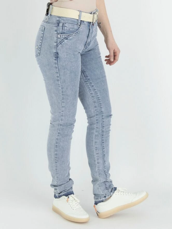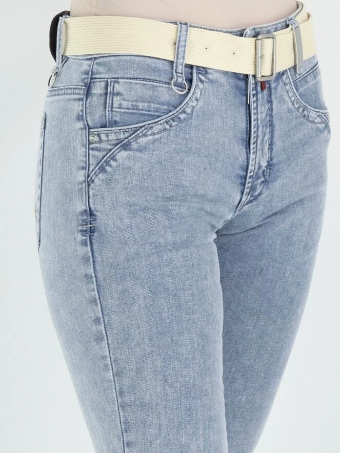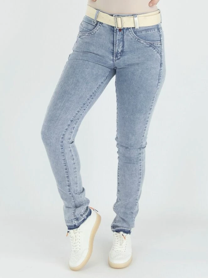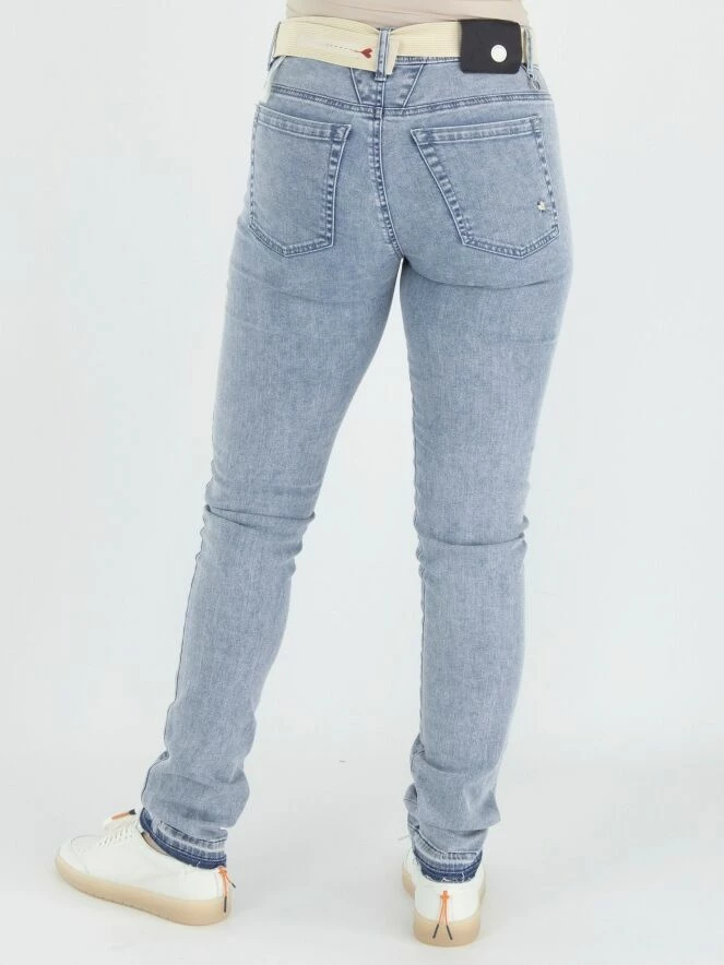 Un jean de High dans une couleur bleu denim clair. Le jean est dans un modèle à 5 poches. À la taille, il y a une ceinture en jute douce de couleur beige. En bas, il y a une bordure imprimée en denim foncé, et le bord est finement effiloché. Ce jean peut être lavé à 30 degrés.