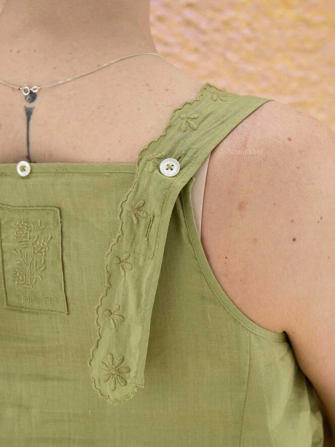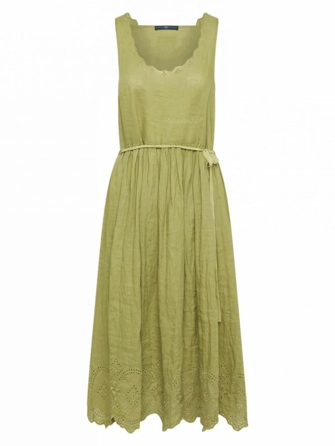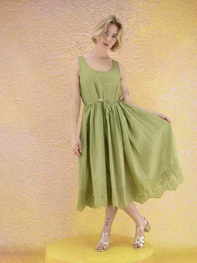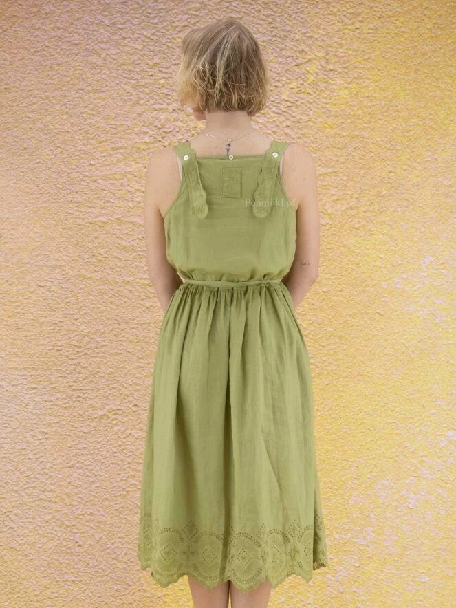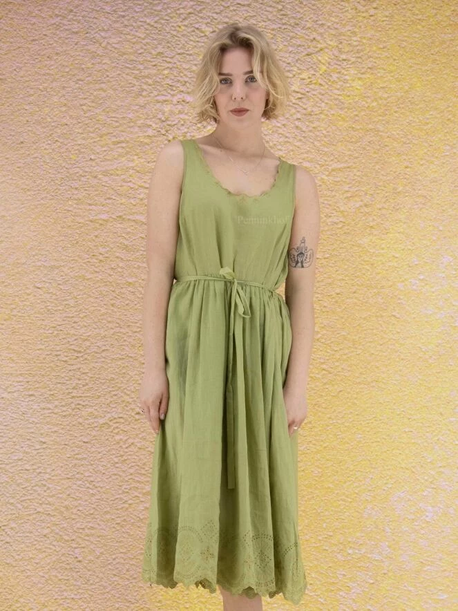Robe sans manches à la coupe en A de la marque High, de couleur vert pistache. L’encolure ronde est bordée d’un traitement ajouré de fleurs. A partir de la taille, le tissu est délicatement plissé. Une étroite ceinture satinée permet de resserrer la taille ou d’être nouée dans le dos. Le bas de la robe est orné d’un large ajour en forme de cercles avec un ourlet à pointes. Lavage à la main.