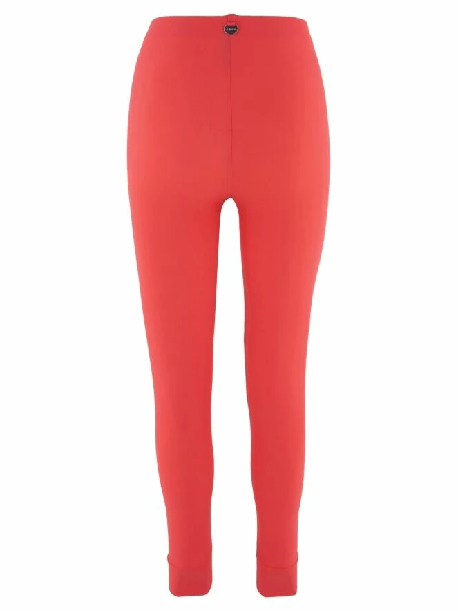 Un legging de High en rouge corail. Il y a une bande élastique à la taille. En bas, il y a un large bord avec une couture. Ce legging peut être lavé à 30 degrés.
