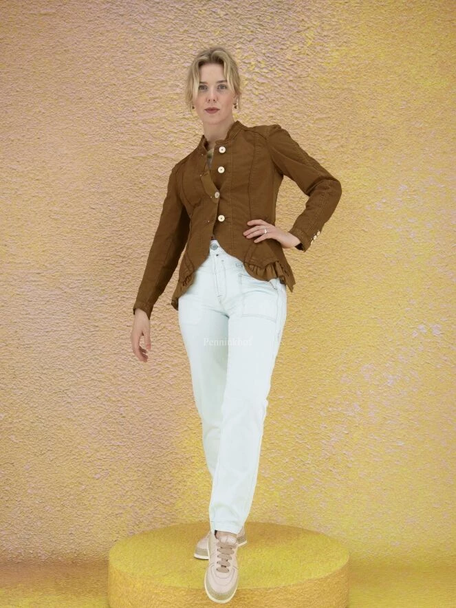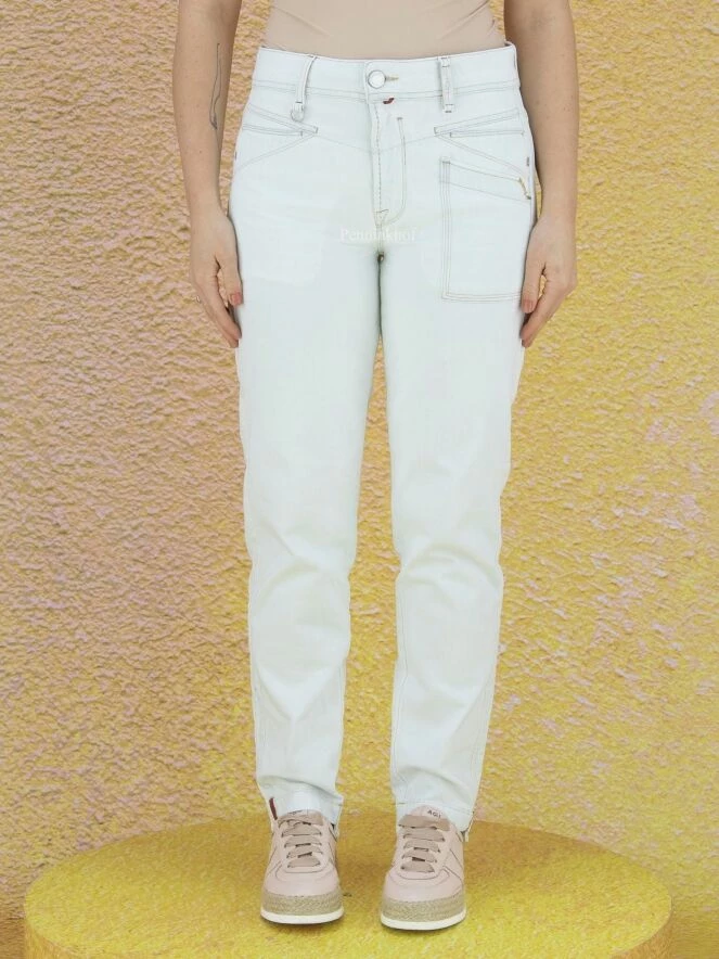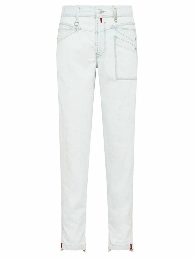 Jeans de la marque High, en denim couleur blue jeans très clair. Toutes les coutures de ce jean sont de couleur cognac. Le bas du pantalon asymétrique est agrémenté d’un petit détail cognac. Lavage à 30 degrés.