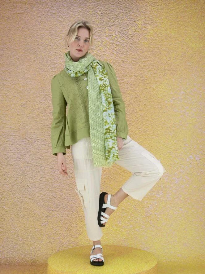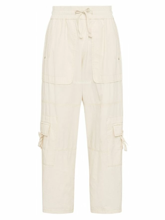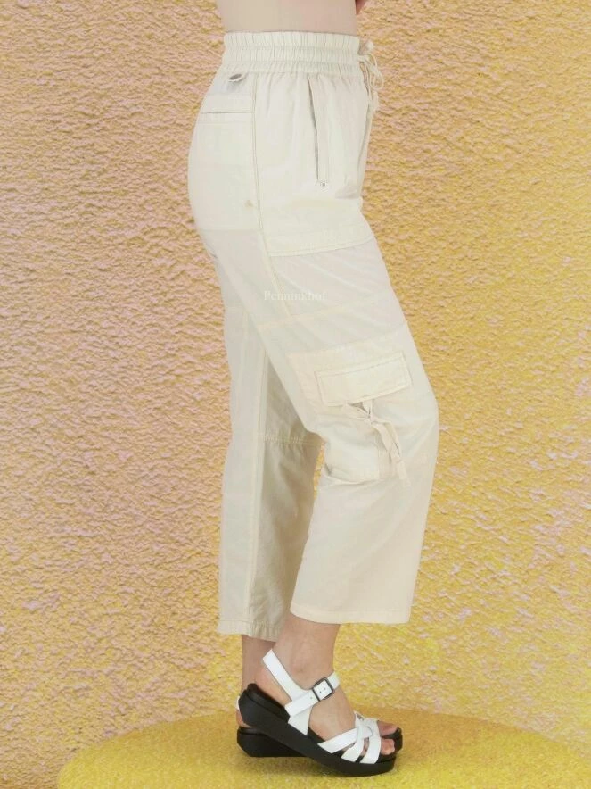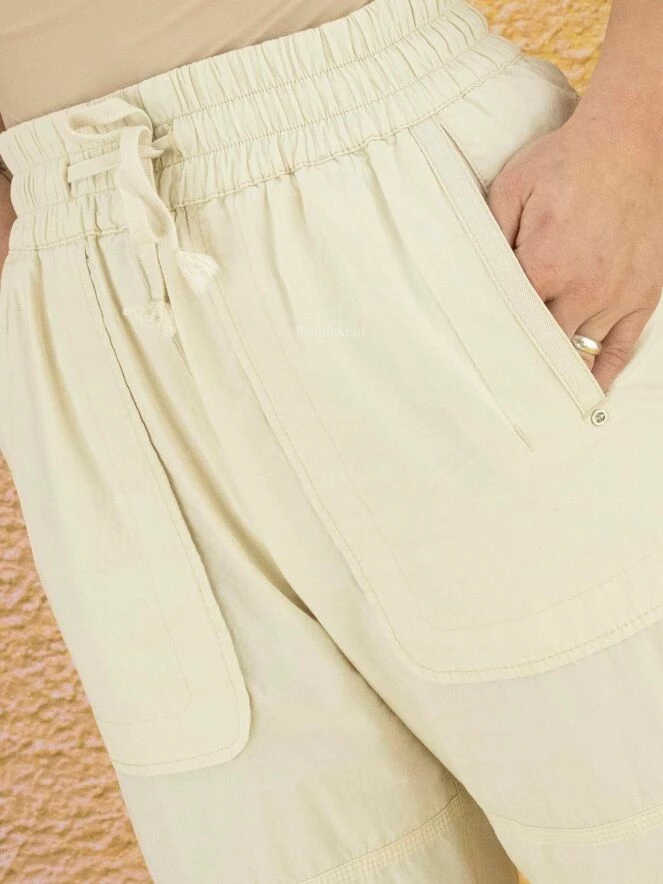 Pantalon cargo de la marque High, de couleur blanc crème. La taille est équipée d’une bande élastique froncée avec un cordon de serrage sous tunnel. Les poches oversize plaquées sur le devant ont une ouverture passepoilée latérale bordée d’un ruban. Deux autres poches au niveau du genou sont à rabat avec un ruban noué. Lavage à la main.