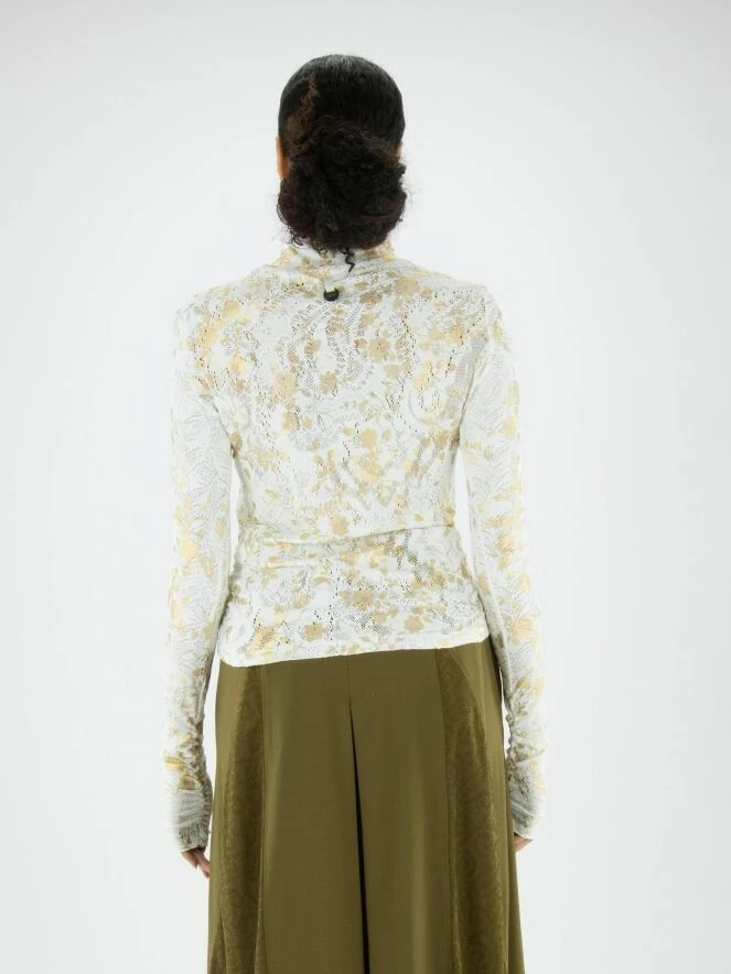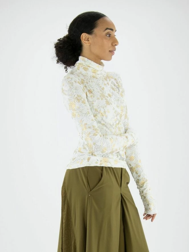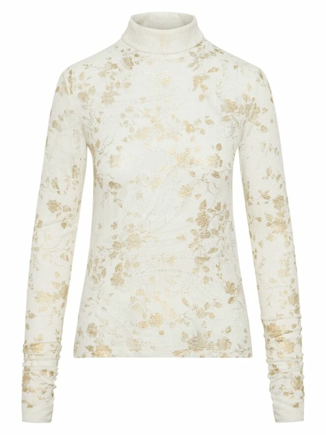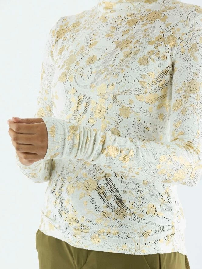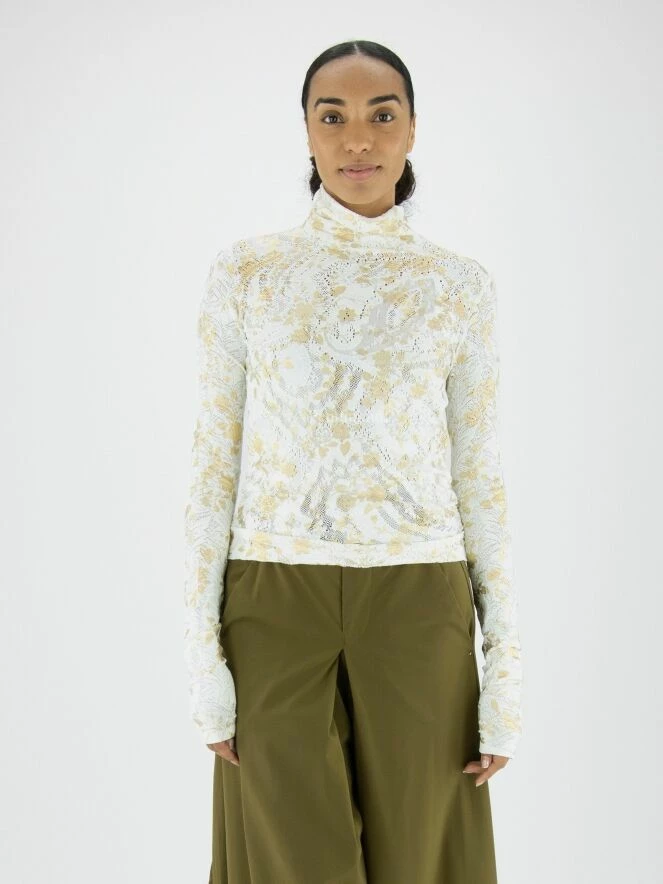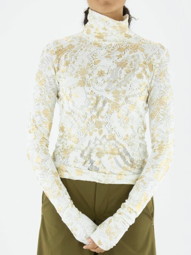 T shirt élastiqué de High en blanc avec un imprimé de fleurs dorées. Le tissu est légèrement perforé. La T – shirt a un col roulé et peut être lavée à la main.