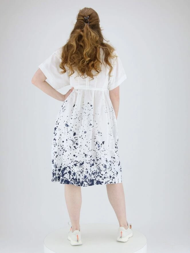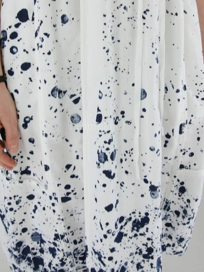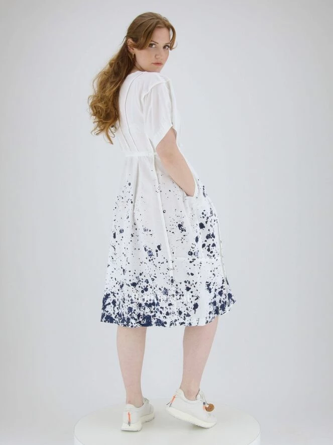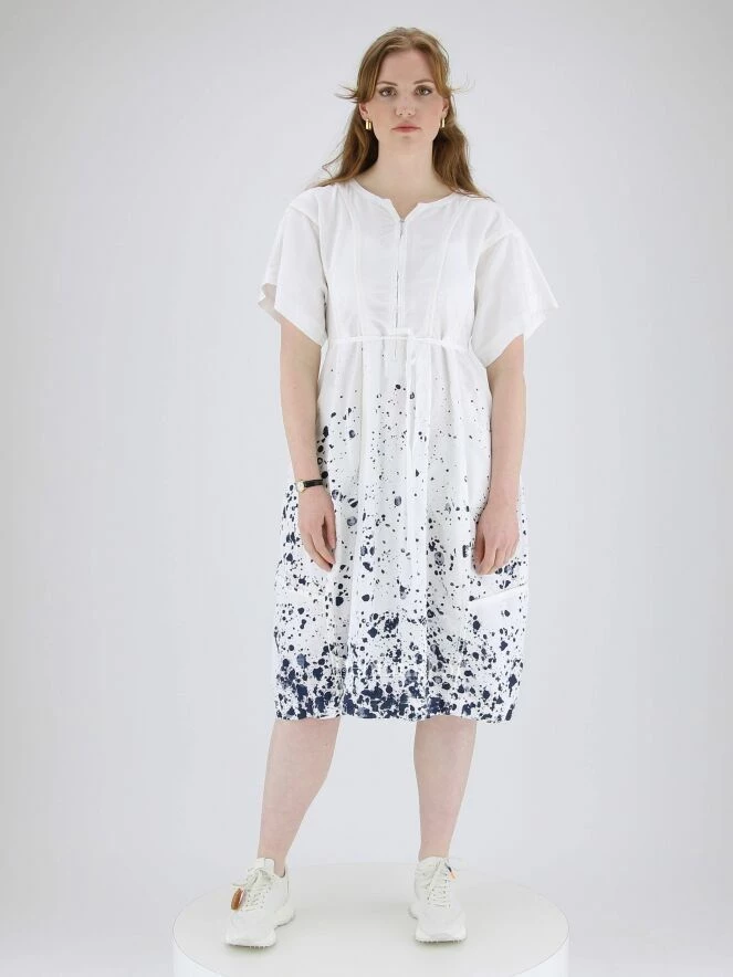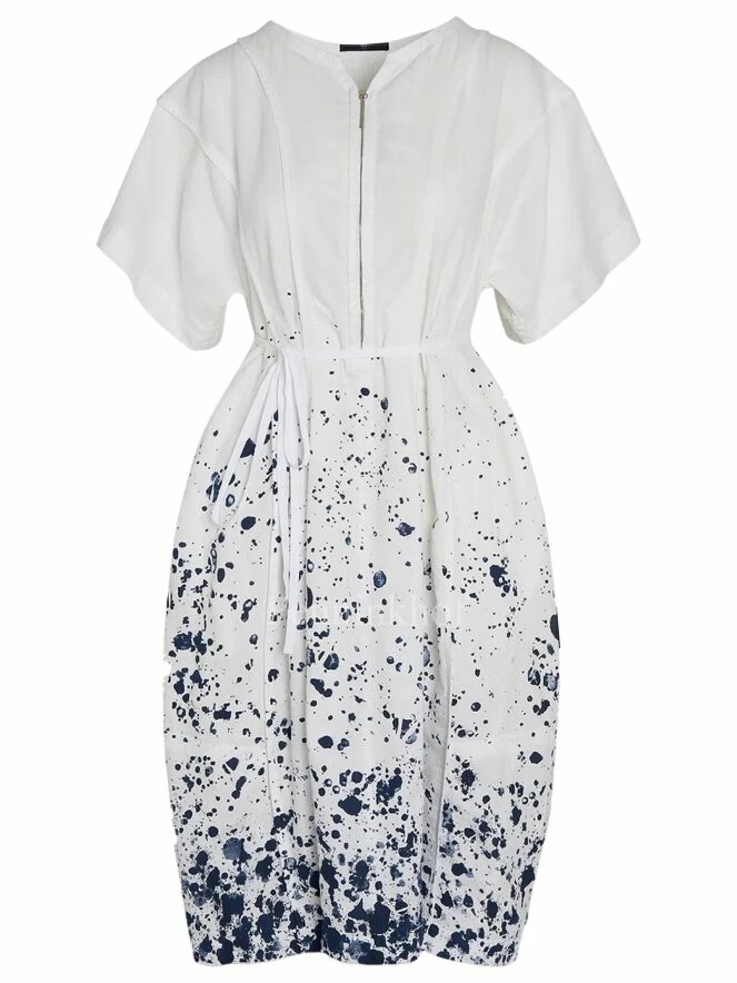 Robe de la marque High, de couleur blanche unie. A partir de la taille, la robe est imprimée d’éclaboussures de peinture de couleur bleu marine. Un cordon sous tunnel ressort à l’avant pour s’enrouler en ceinture nouée à l’arrière. Des coutures arrondies et modelées sur les côtés créent la forme en œuf. La robe est équipée de poches latérales insérées en couture. La fermeture Eclair située à l’avant descend de l’encolure jusqu’à la taille. Lavage à 30 degrés.
