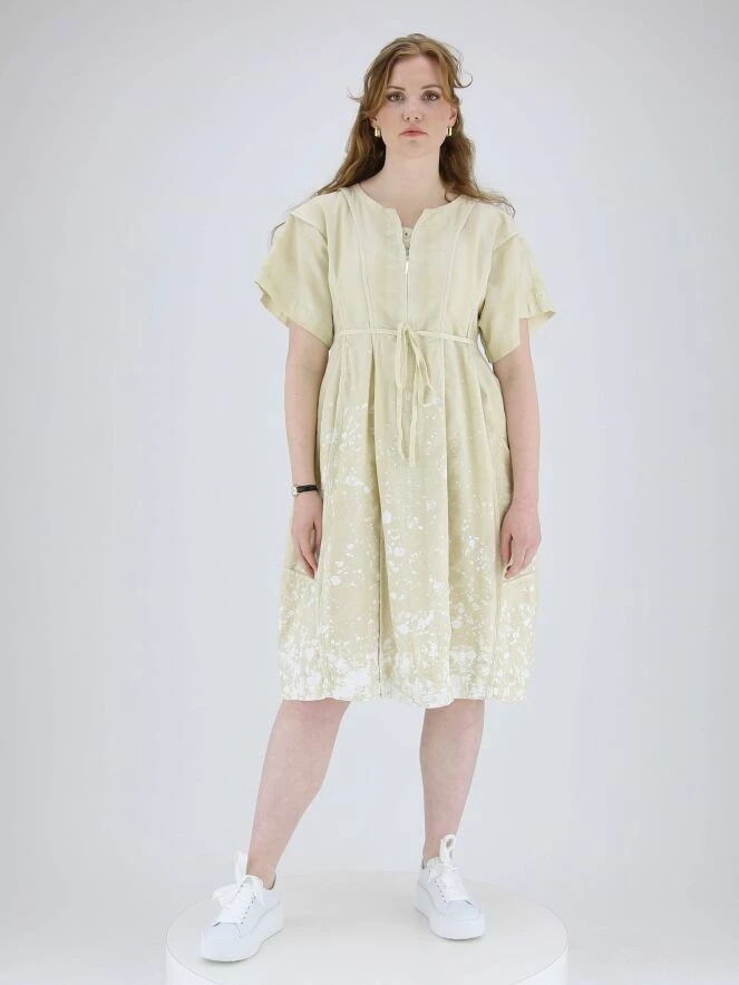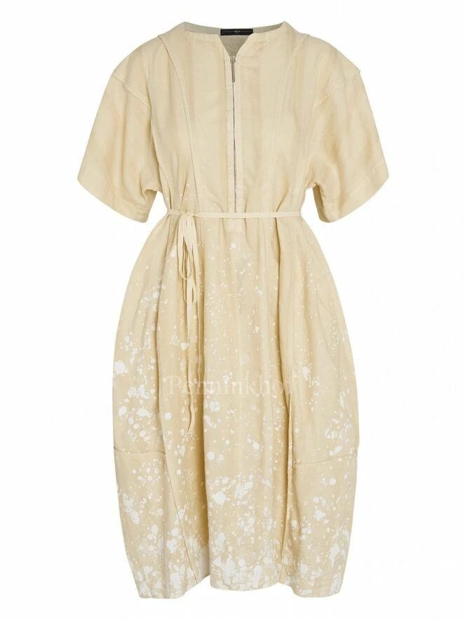Robe de la marque High, de couleur beige unie. A partir de la taille, la robe est imprimée d’éclaboussures de peinture de couleur blanche. Un cordon sous tunnel ressort à l’avant pour s’enrouler en ceinture nouée à l’arrière. Des coutures arrondies et modelées sur les côtés créent la forme en œuf. La robe est équipée de poches latérales insérées en couture. La fermeture Eclair située à l’avant descend de l’encolure jusqu’à la taille. Lavage à 30 degrés.