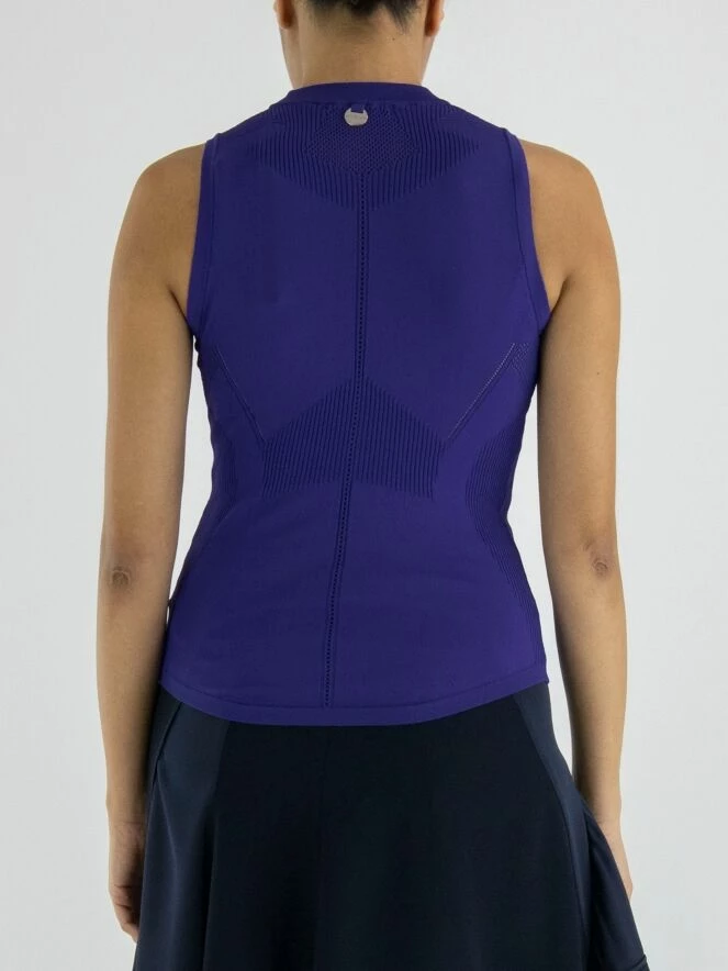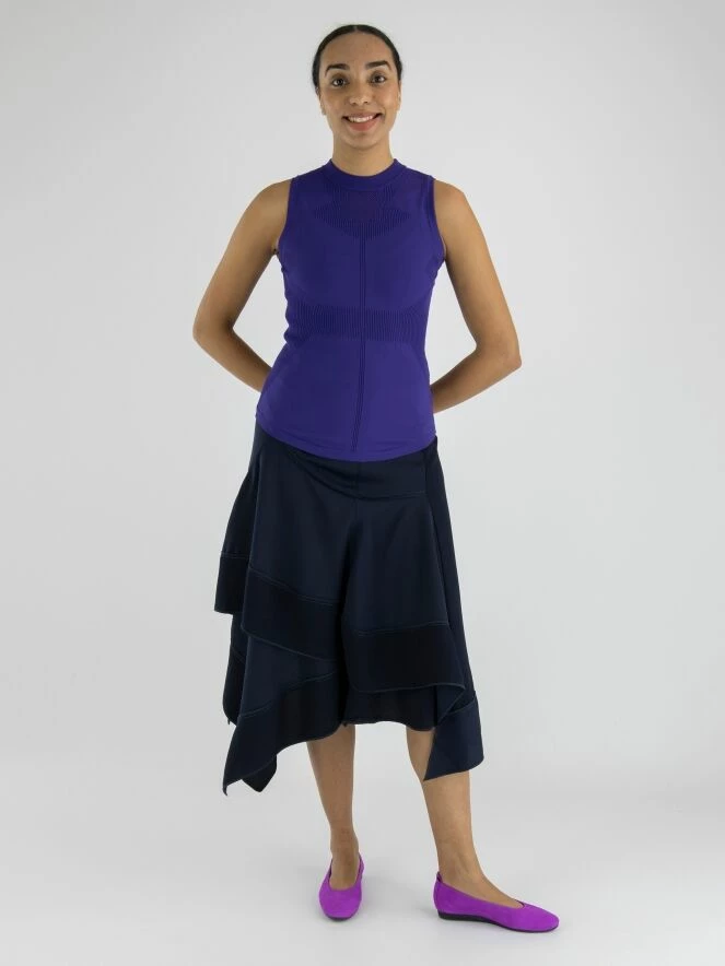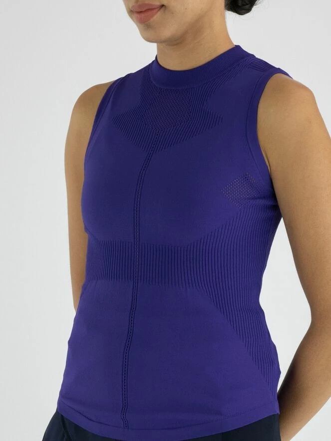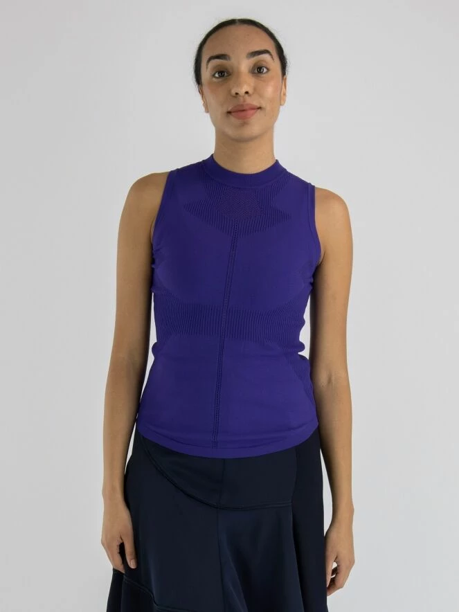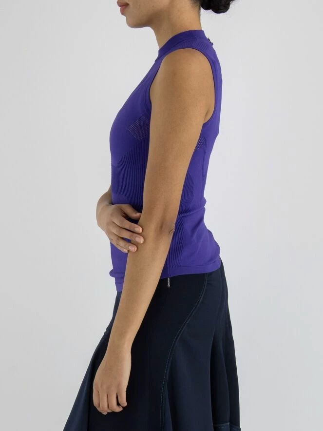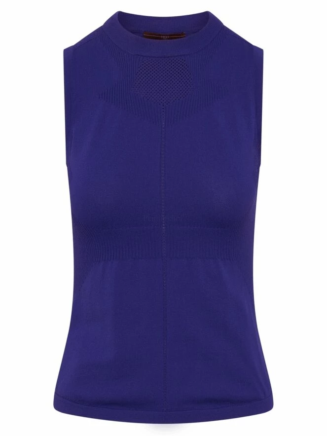 Un top de High en bleu cobalt. Le long du col rond haut et à la taille, il y a un bord en tricot finement côtelé. Au milieu du devant et du dos, il y a une bordure ajourée. Sous les aisselles et en dessous du bord du col, le tissu est finement perforé. Ce top élastique peut être lavé à la main.