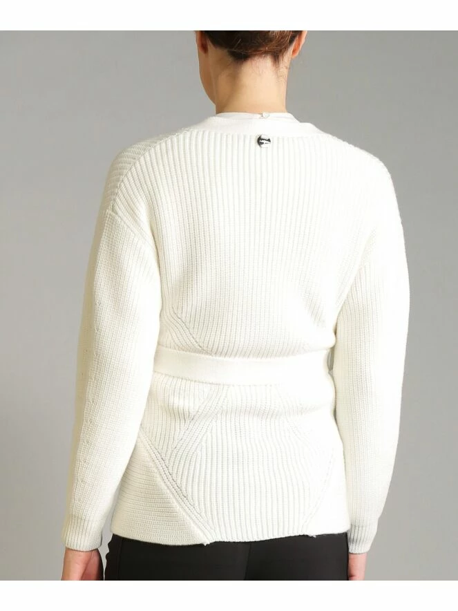 Cardigan côtelé en mélange de laine de couleur blanc crème, de la marque High. Le cardigan présente un col en V avec une fermeture à 4 boutons. A la taille, une ceinture en tricot est nouée sur l’avant. Des bandes diagonales côtelées habillent le dos. Lavage à la main.
