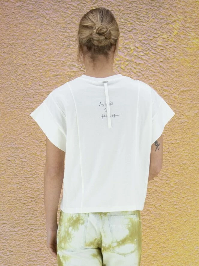 Tee-shirt à la coupe carrée de la marque High, de couleur blanc crème avec un imprimé photo d’artichauts sur fond orange à l’avant qui dépasse de l’ourlet. La photo a été prise par la photographe allemande Laura M. Jelic. Les manches courtes et larges sont à double surpiqûre. Lavage à la main.