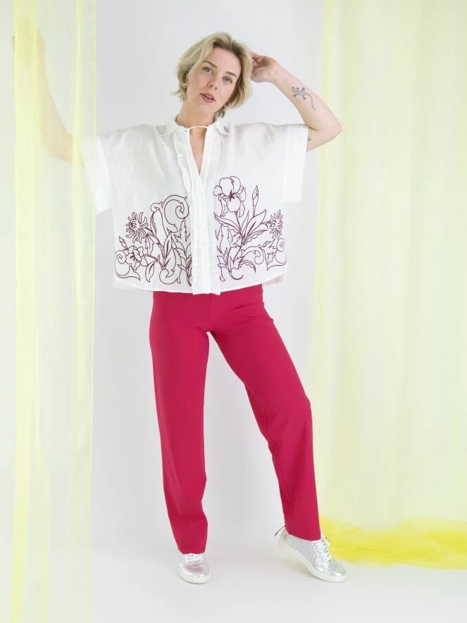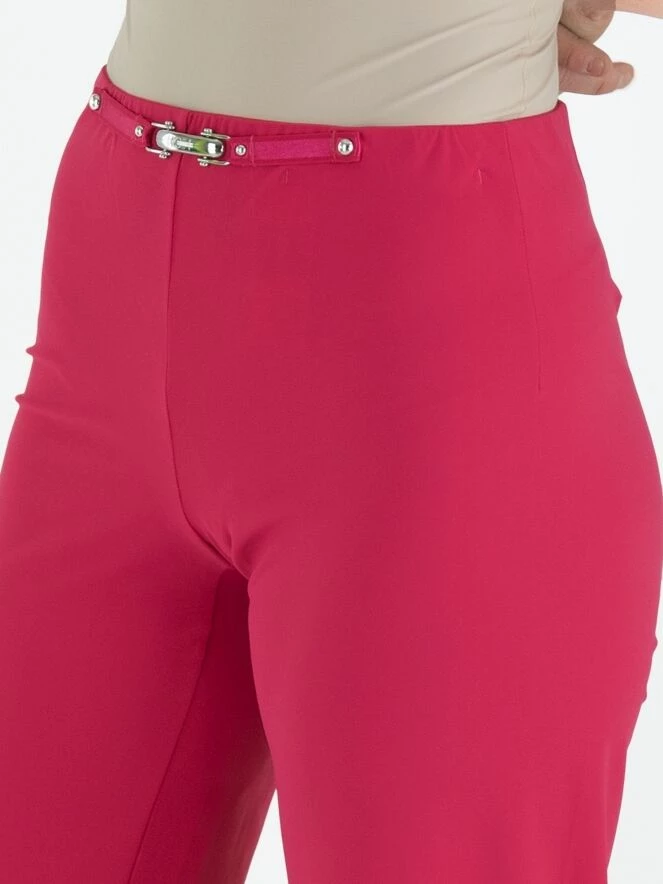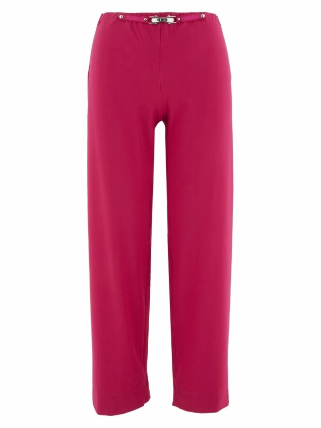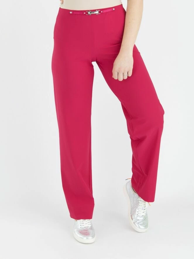 Un pantalon de High en couleur fuchsia. Il y a une bande élastique à la taille. Sur le devant, à la hauteur de la taille, il y a une boucle décorative de couleur nickel avec 2 clous. Ce pantalon peut être lavé à 30 degrés.