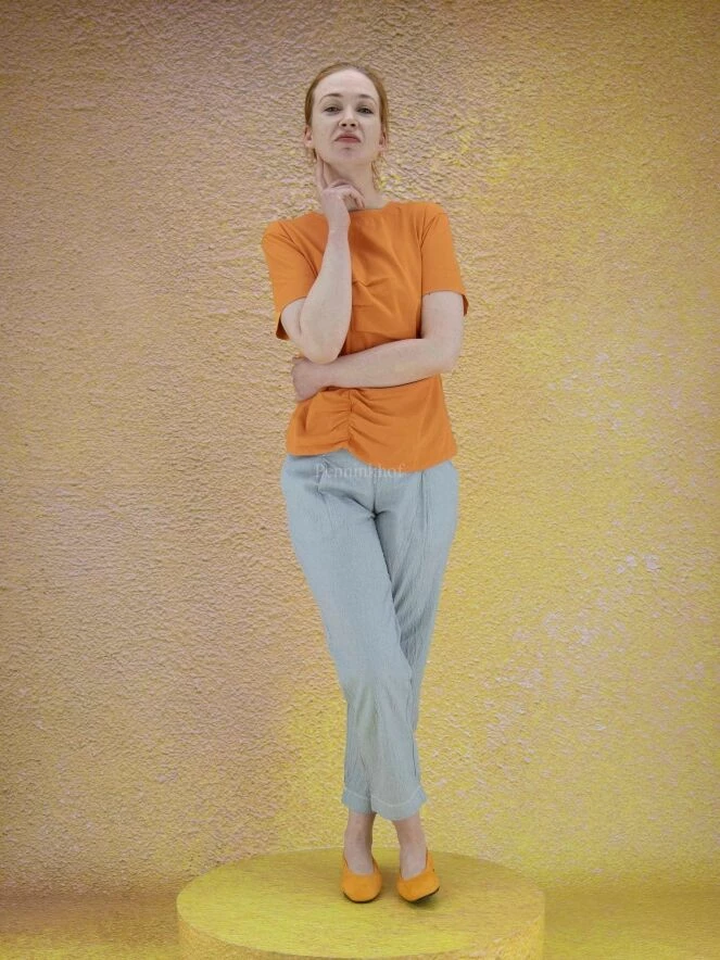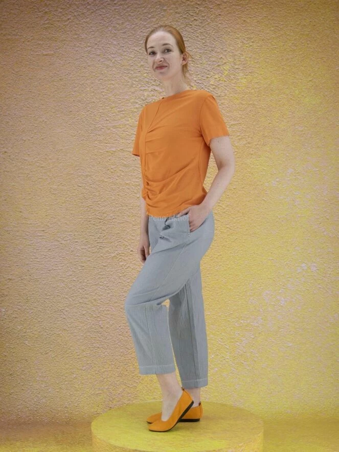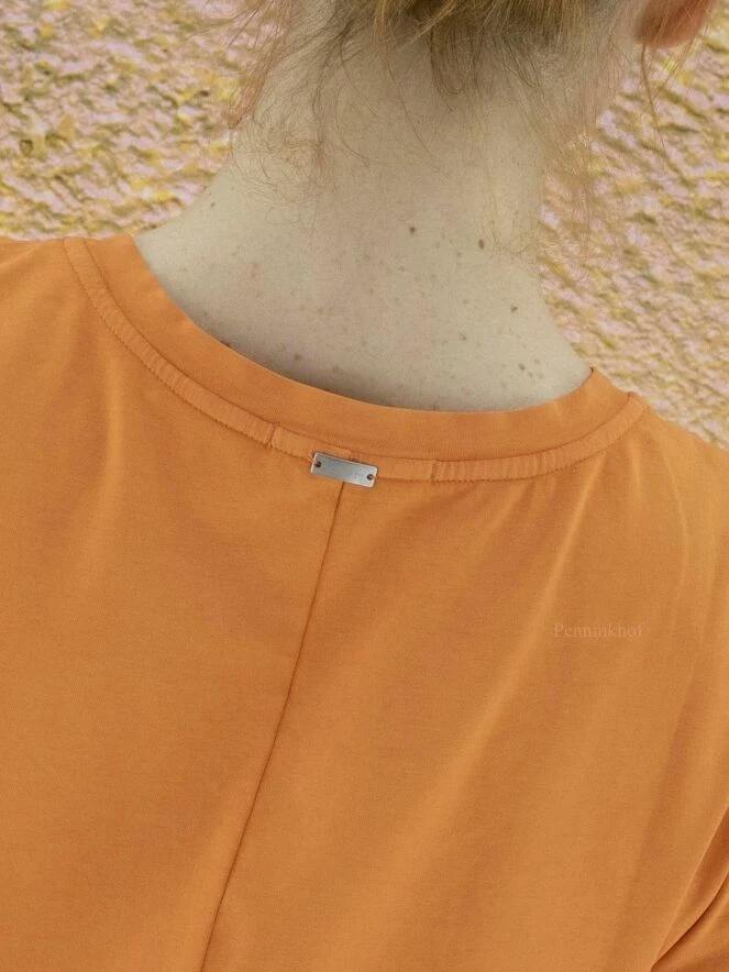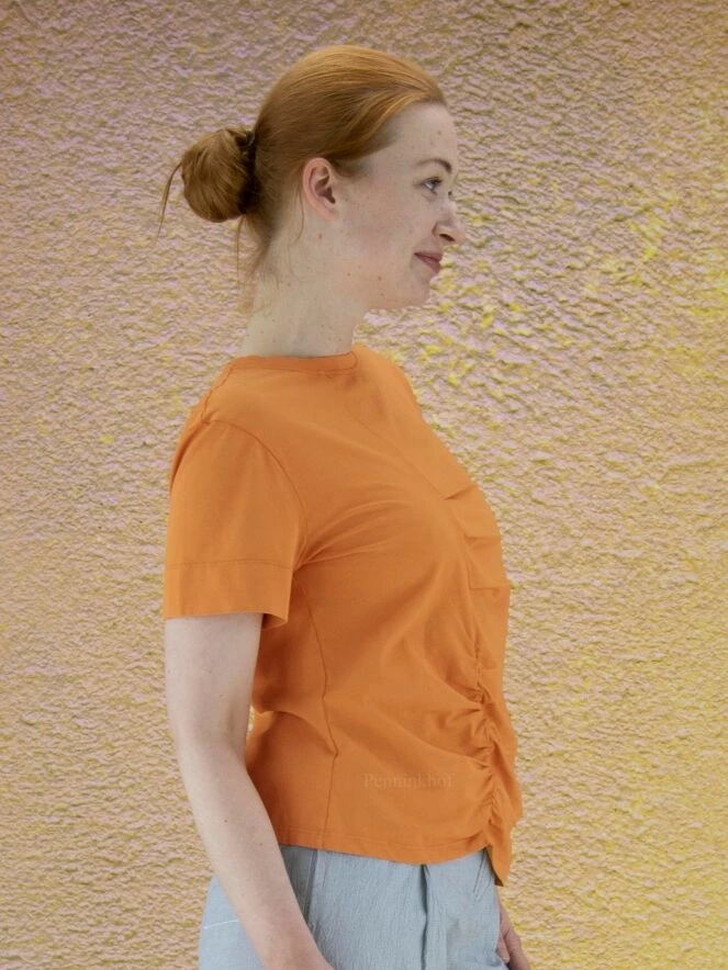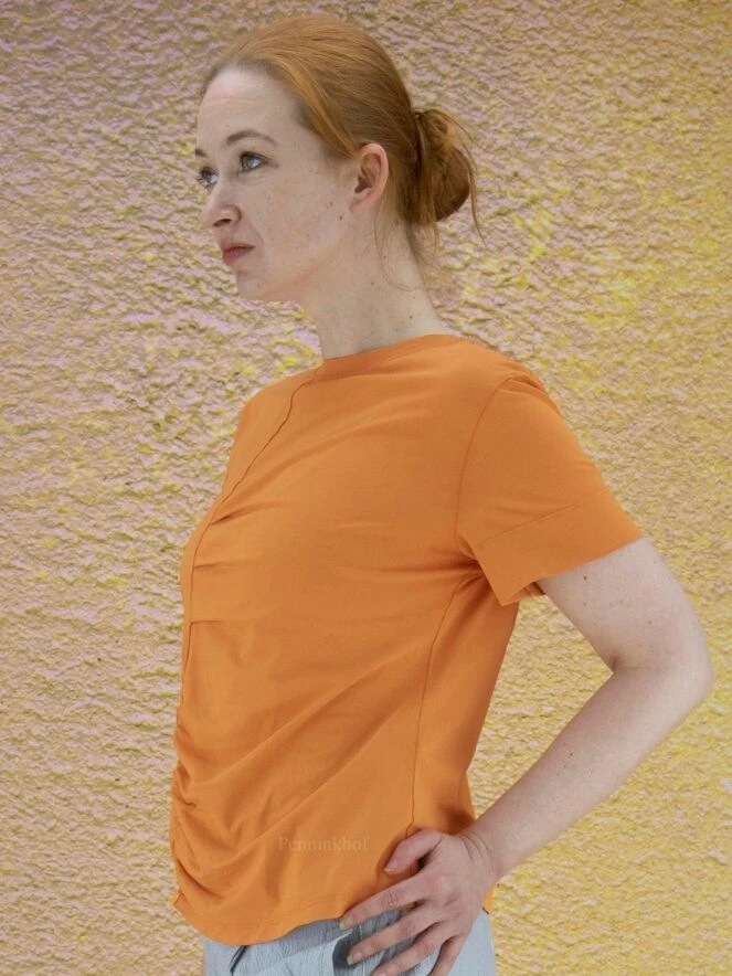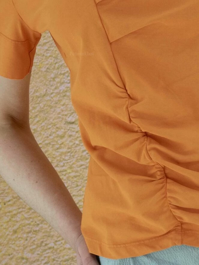 T-shirt de la marque High, de couleur orange. Manches courtes à encolure ronde. Sur le devant, une couture décentrée traverse toute la hauteur avec plusieurs plis et fronces décoratifs de part et d’autre. Lavage à la main.