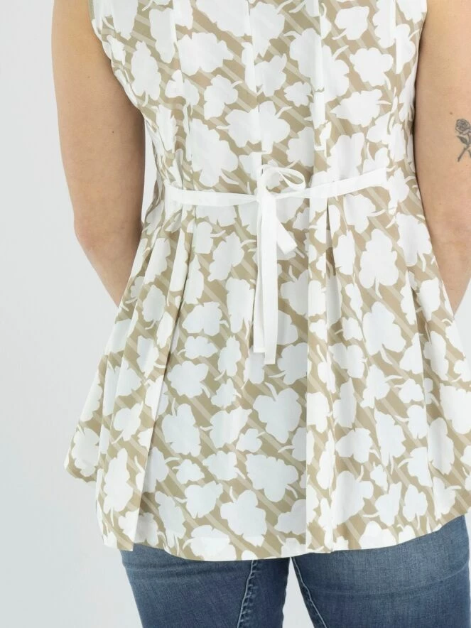 Un top ou hes de High dans un imprimé de feuilles avec les couleurs blanc et sable. À partir de la taille, plusieurs plis donnent un effet de largeur. Dans le bas, il y a de profondes fentes des deux côtés. Ce top doit être lavé à la main.