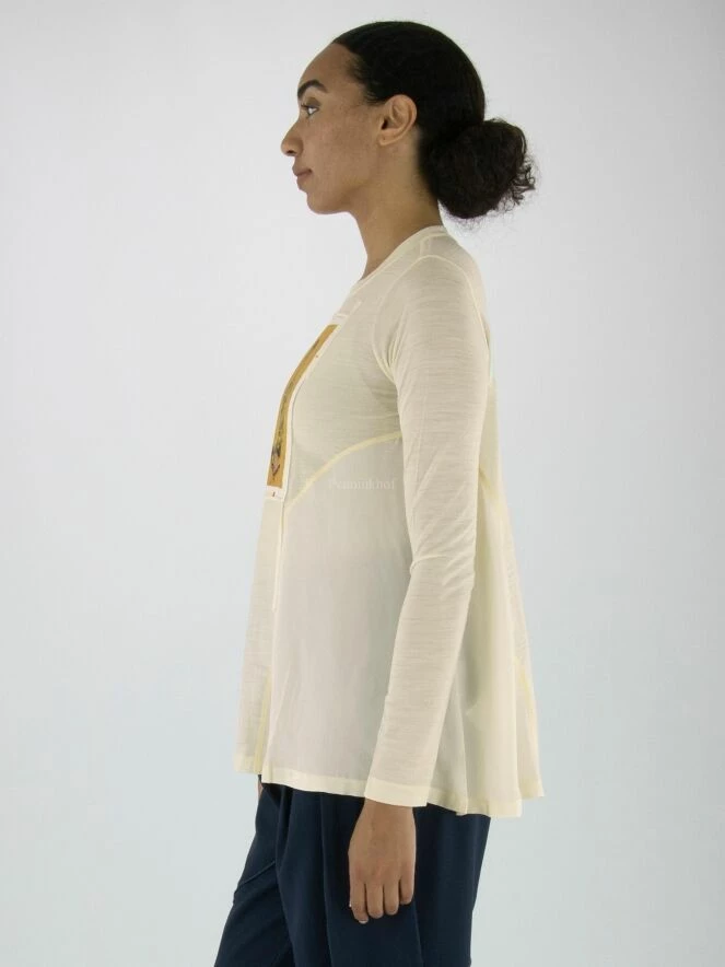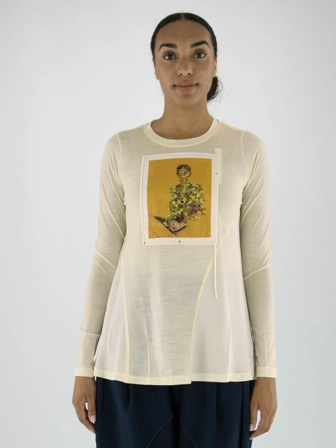 Une T shirt de High en blanc crème. Sur le devant figure une photo du photographe Enrico de Luigi. La chemise a une ligne A et, à partir de l’aisselle, les côtés sont en tissu satiné mat. Cette T – shirt peut être lavée à la main.