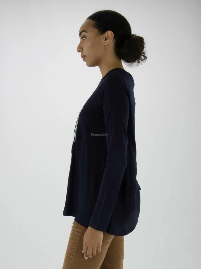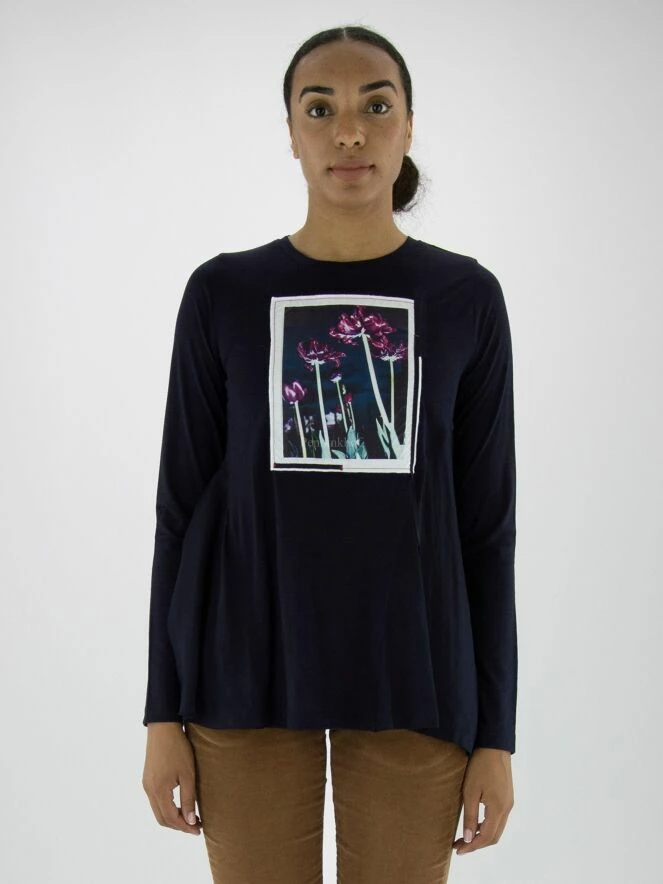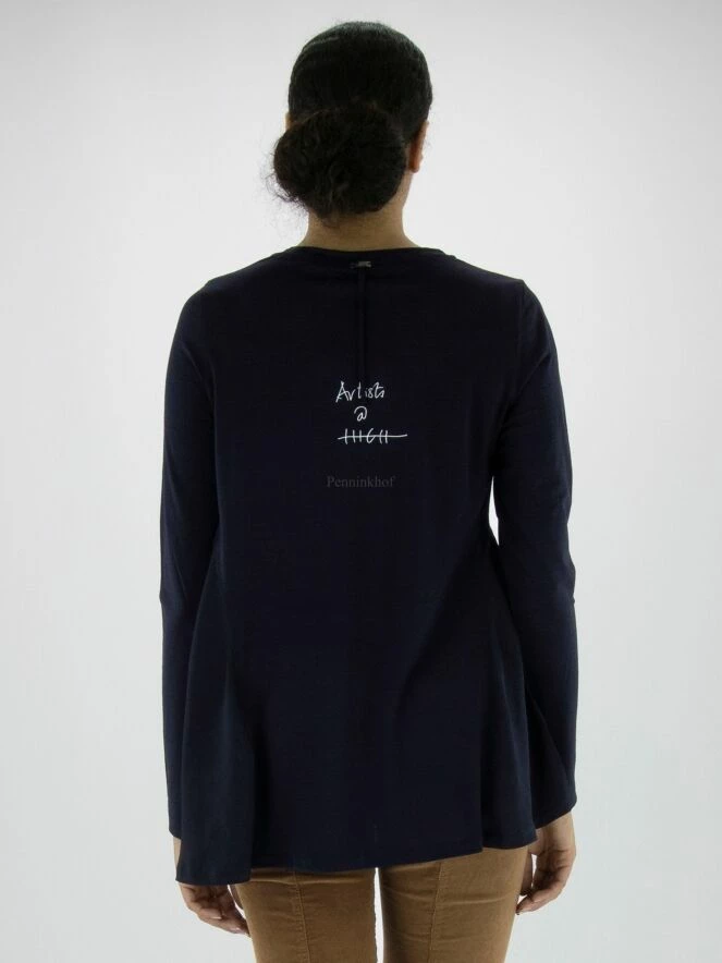 Un T shirt de High en bleu marine. Sur le devant figure une photo du photographe Enrico de Luigi. Le T – shirt a une ligne A et à partir de l’aisselle, les côtés sont dans un tissu satiné mat. Ce T – shirt peut être lavé à la main.