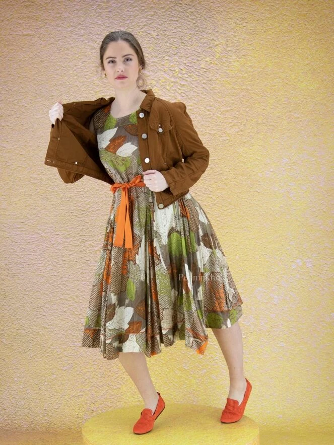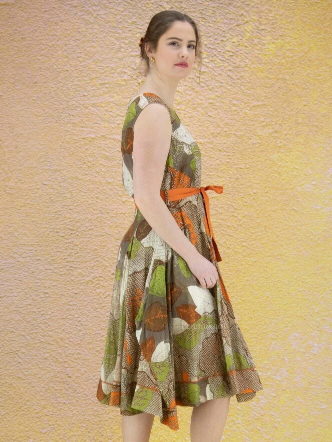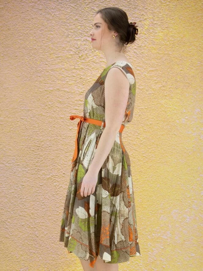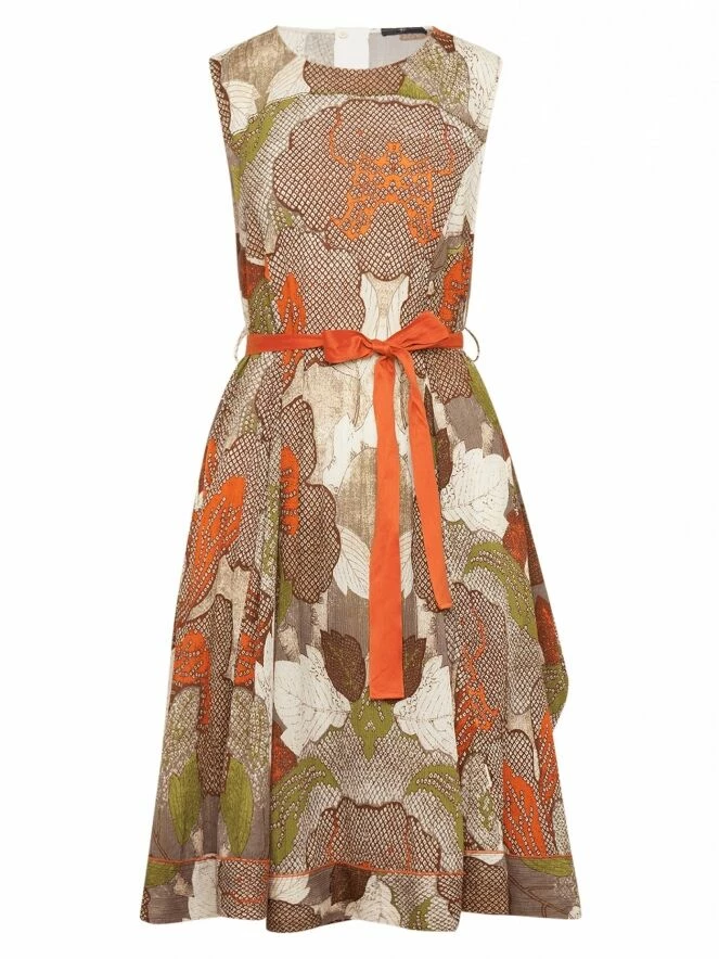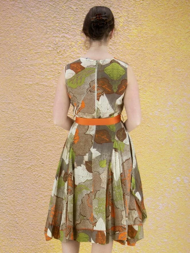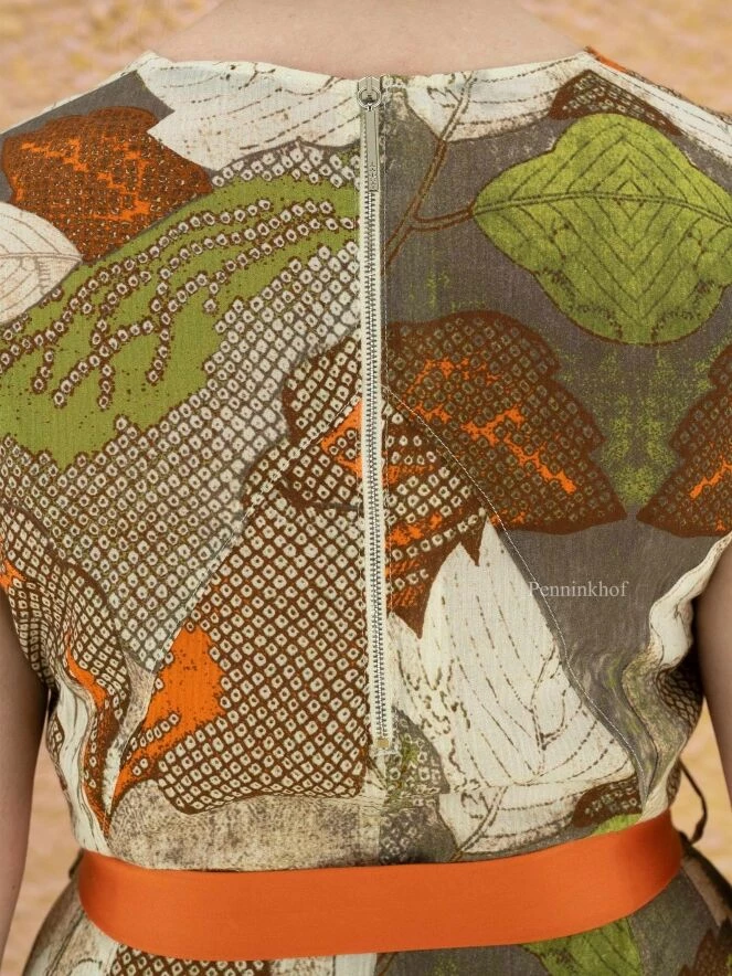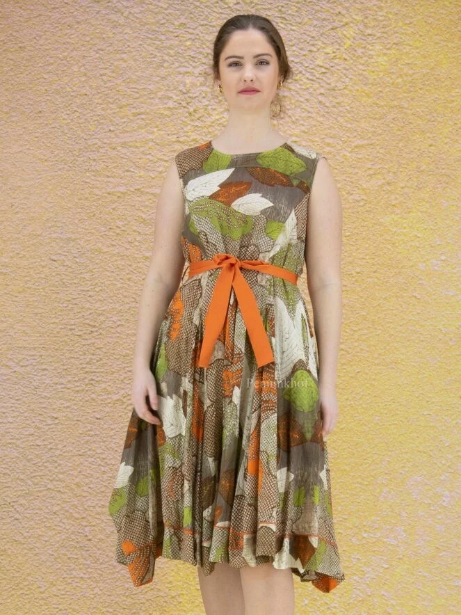 Robe sans manches et encolure ronde de la marque High, à imprimé abstrait de feuilles aux multiples nuances de taupe, orange et vert avec du blanc. Une large ceinture orange satinée est fixée à la taille. À partir de la taille, la robe présente une ligne A. La robe est dotée de poches latérales au niveau de la taille. Lavage à 30 degrés.