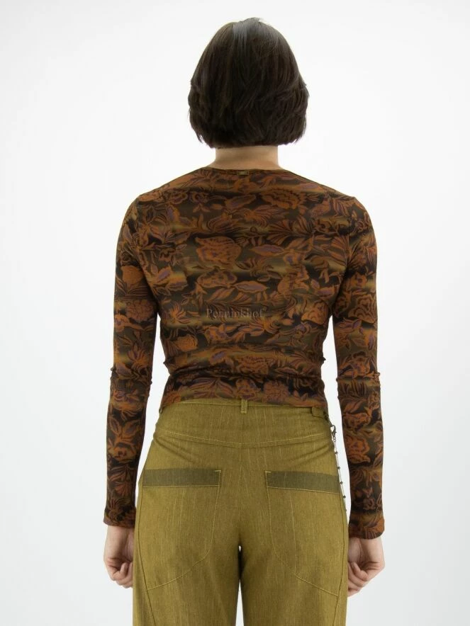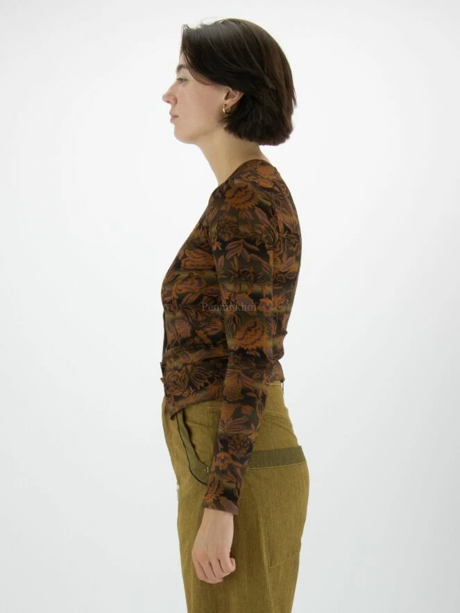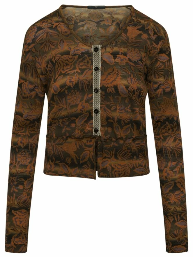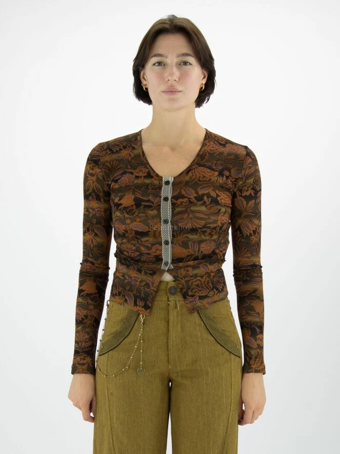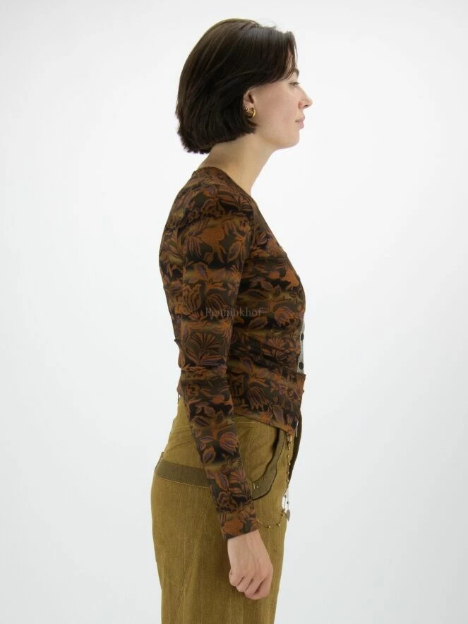 Cardigan court de High à l’imprimé baroque aux couleurs orange, vert et lilas. Le long de la fermeture à boutons se trouve un passepoil à l’imprimé à carreaux fins. Ce gilet peut être lavé à la main.
