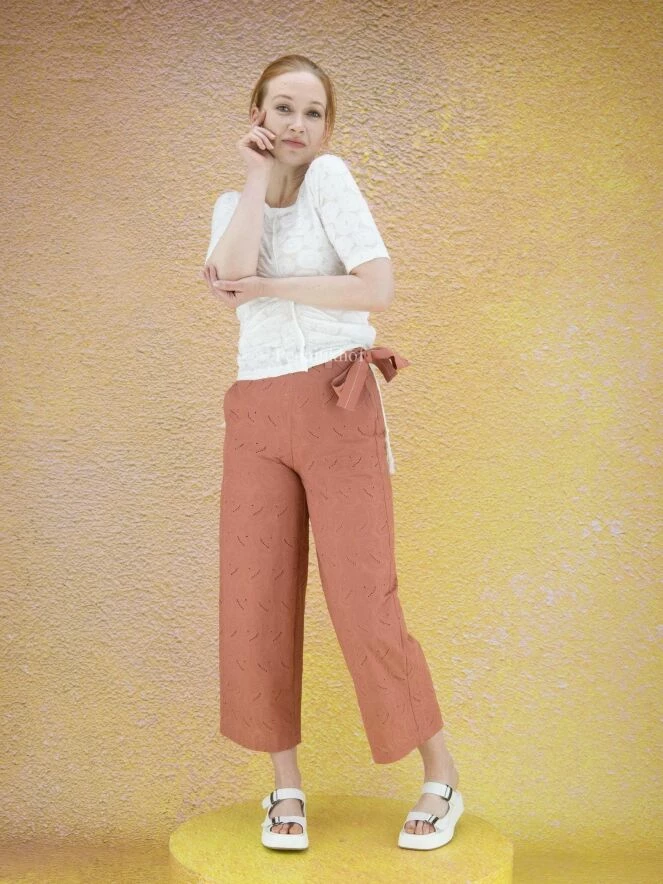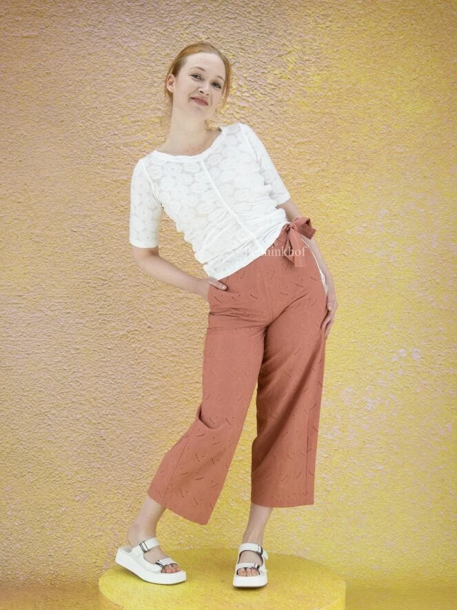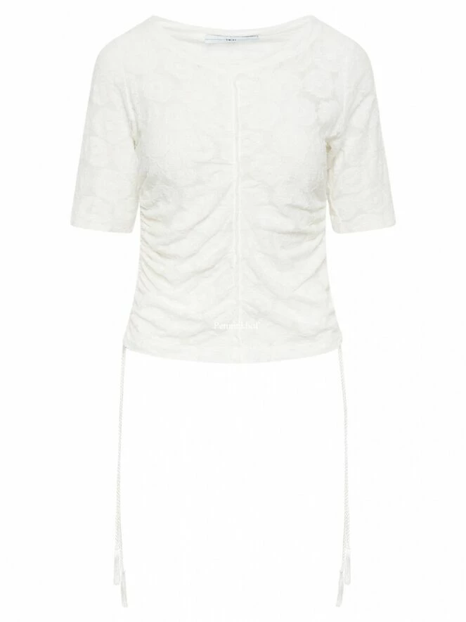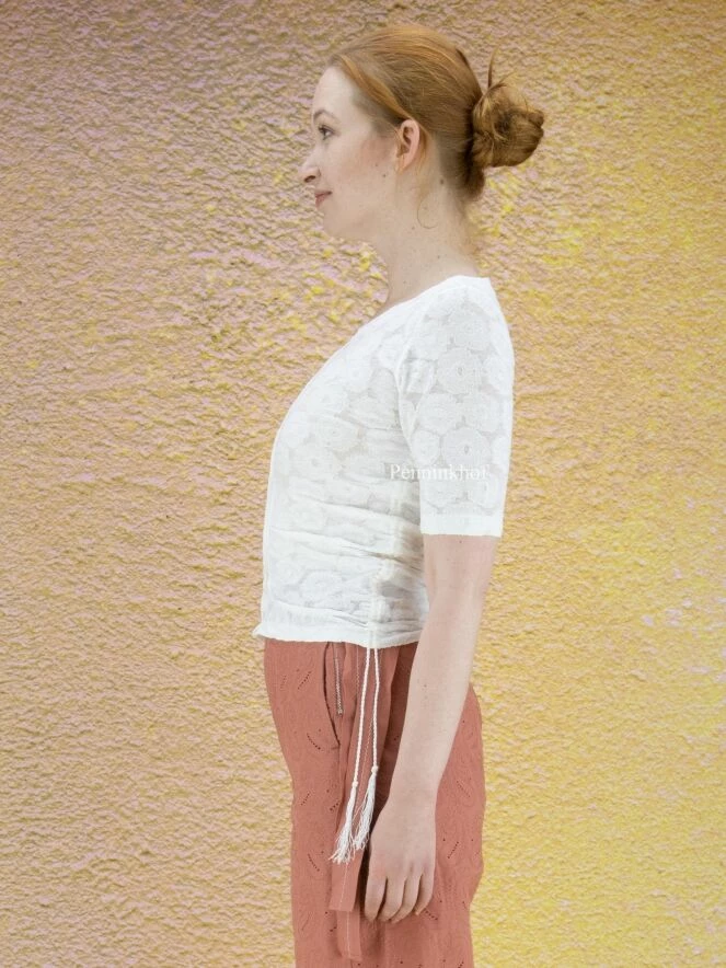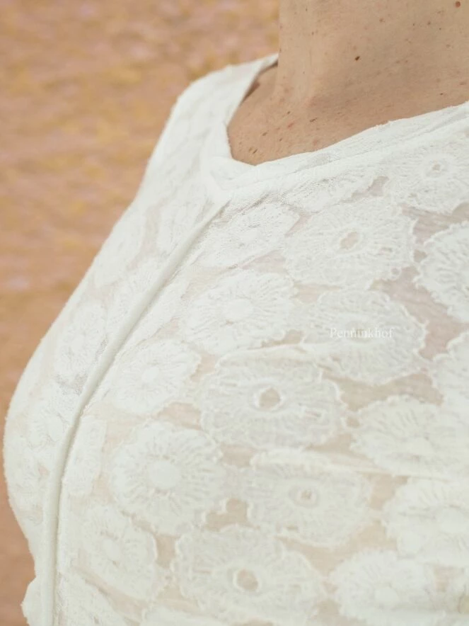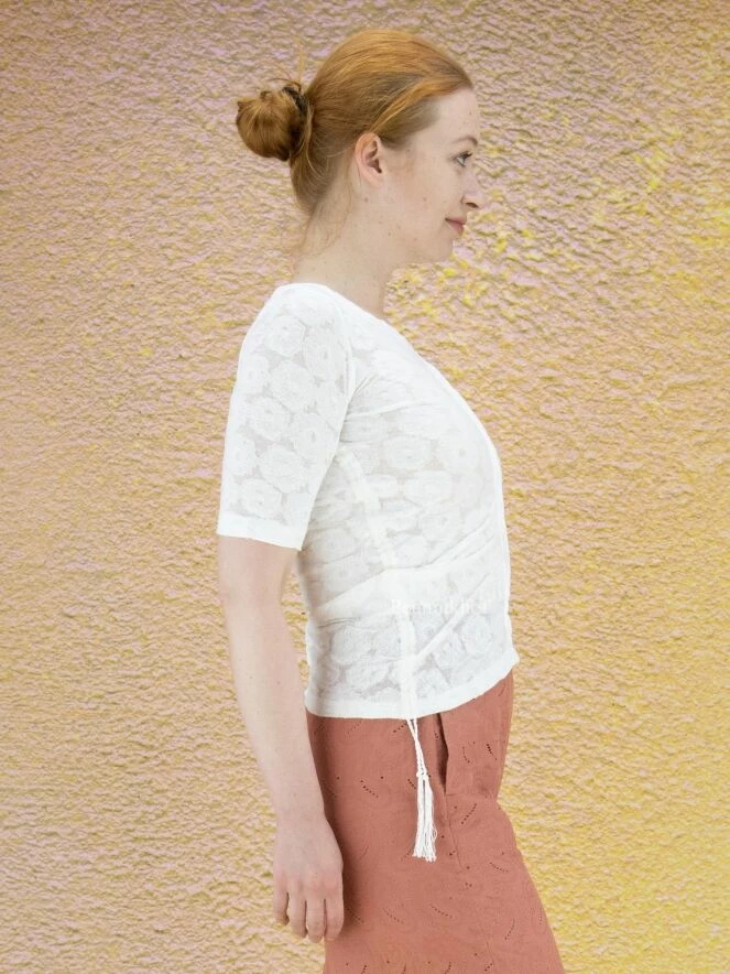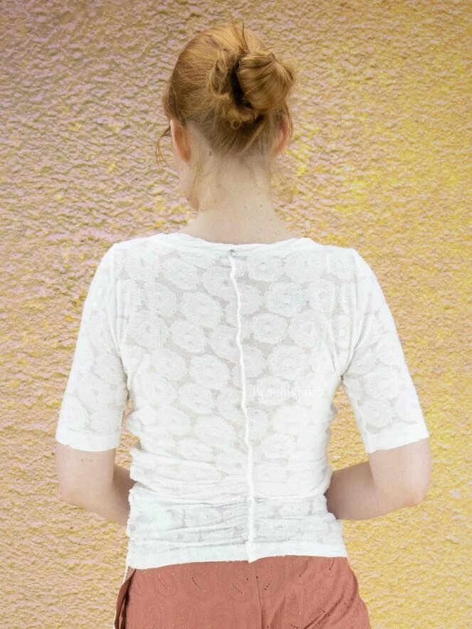 Chemise légèrement transparente de la marque High, à motif jacquard floral , de couleur blanc crème. Le large décolleté est bordé du même tissu. Le devant possède une couture renversée centrale. Sur les côtés, à partir de l’aisselle, un cordon peut être utilisé pour créer un effet plissé. Lavage à la main.