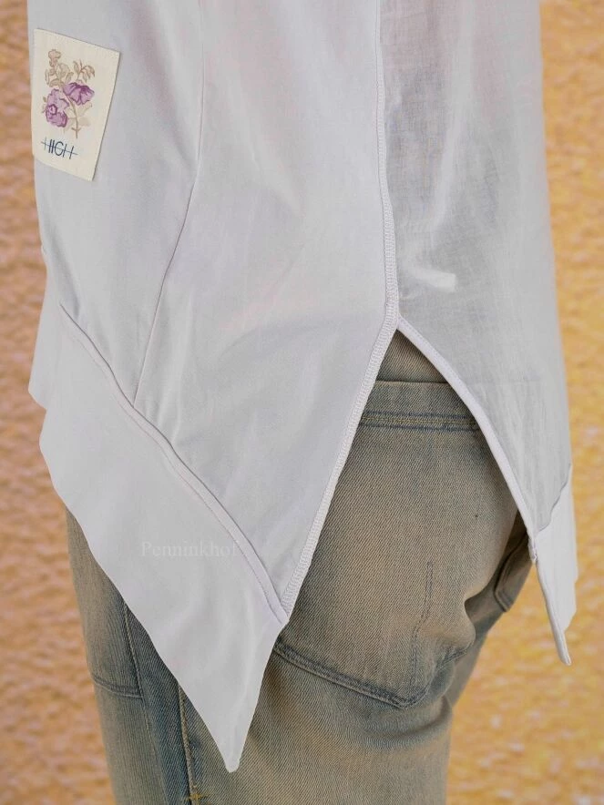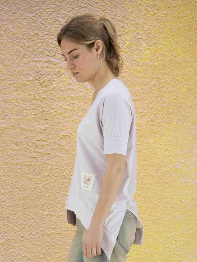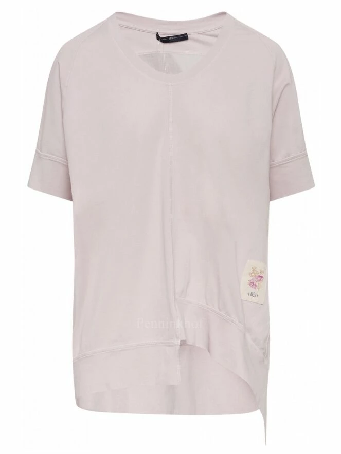 Tee-shirt asymétrique, de la marque High, de couleur lilas. Le dos est dans un tissu légèrement transparent. Le tee-shirt est doté d’une encolure ronde et de manches courtes raglan bordées du même tissu. Une profonde fente sur le côté gauche accentue l’asymétrie. Lavage à la main.