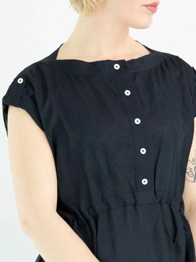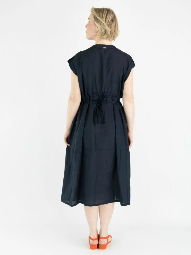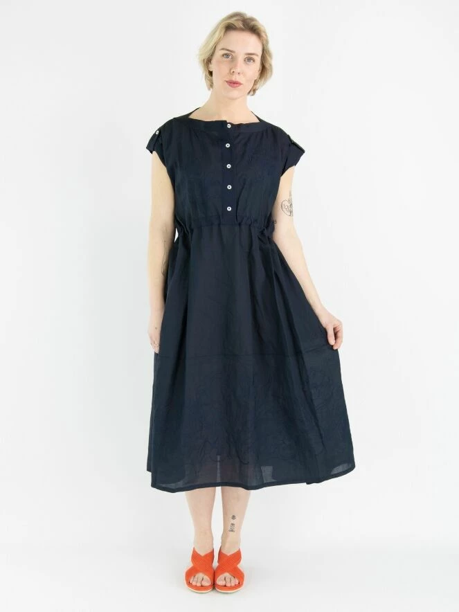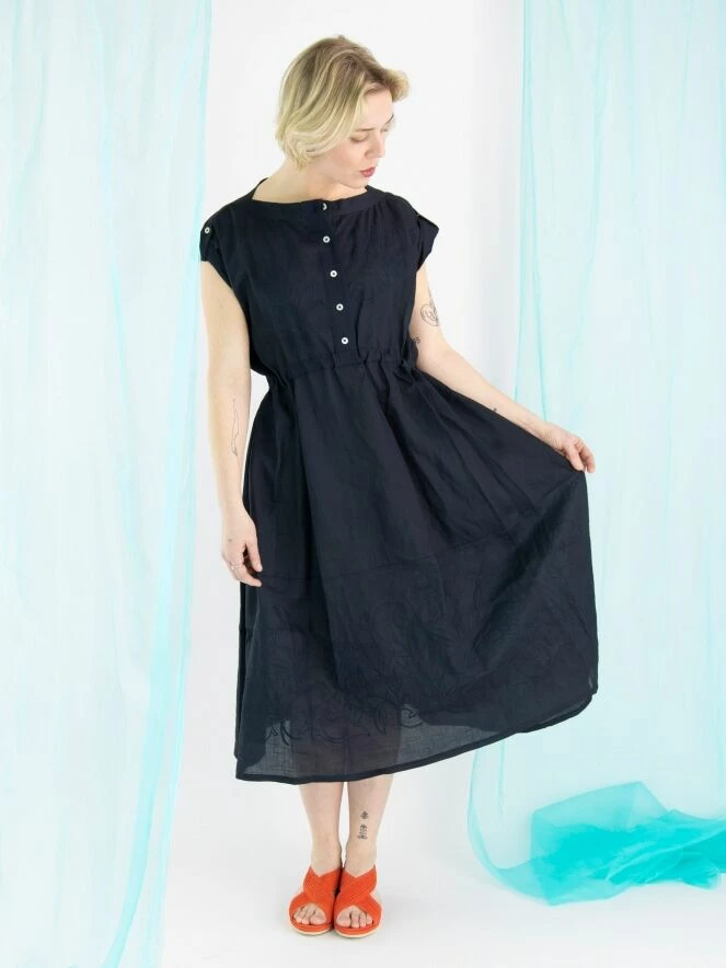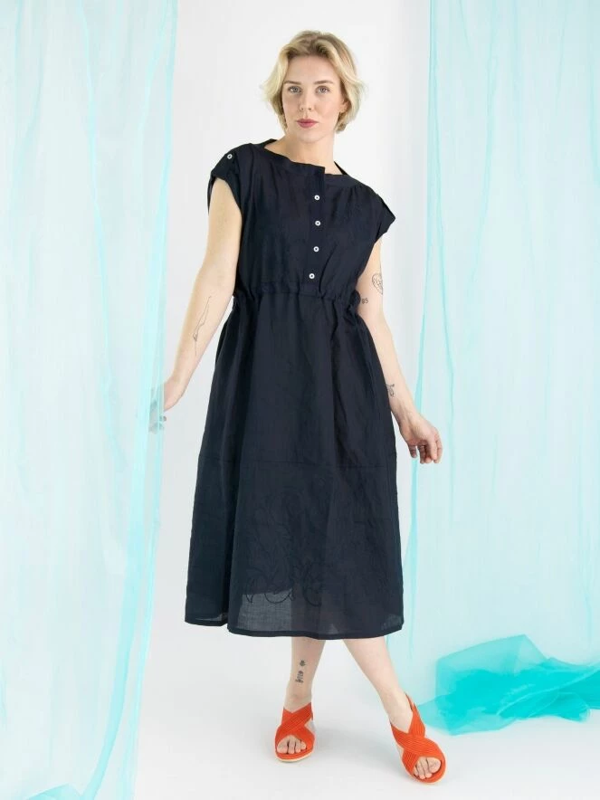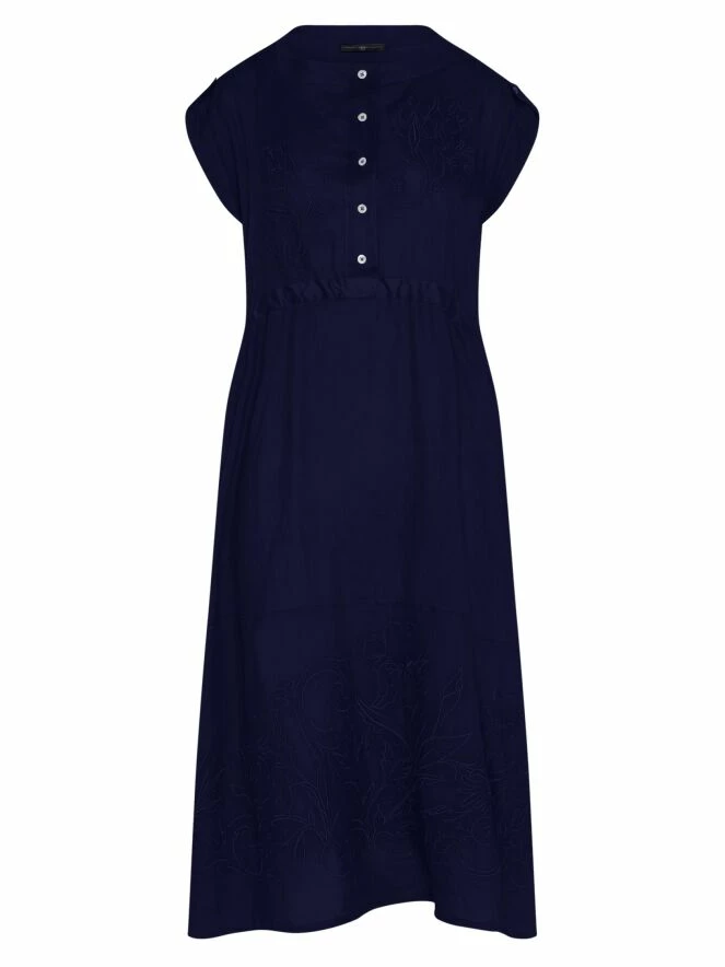 Une robe de High en bleu marine. Du col rond à la taille, il y a une fermeture à boutons. À la taille, il y a une bordure en satin mat avec un ruban en traitement tunnel pour créer un effet cintré. Sur le devant et en bas, il y a un motif de broderie avec des coutures. Cette robe peut être lavée à la main.