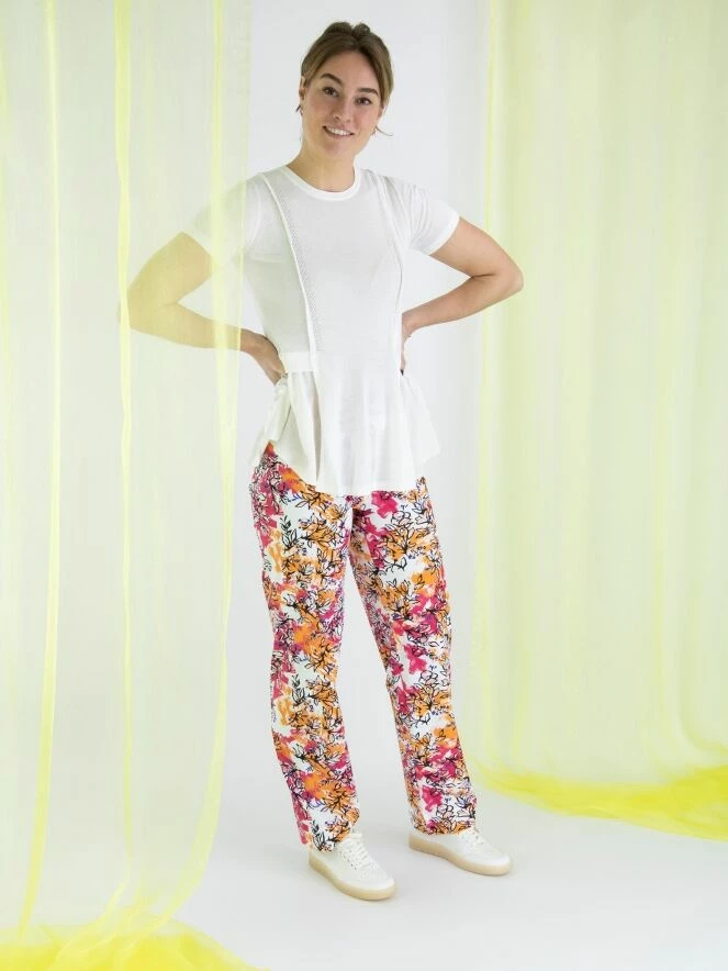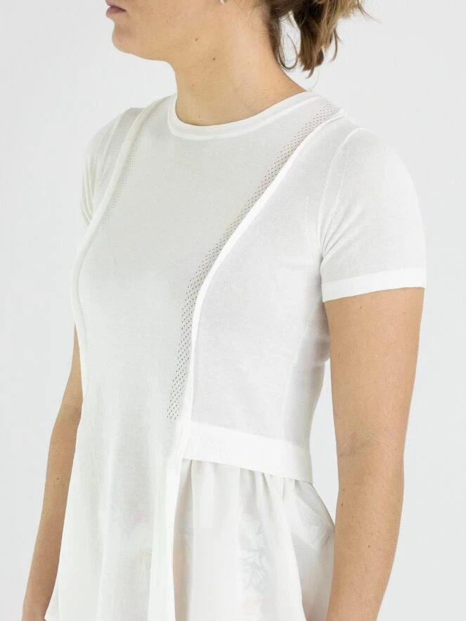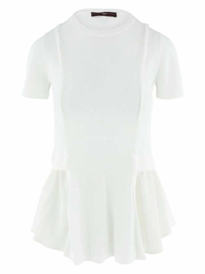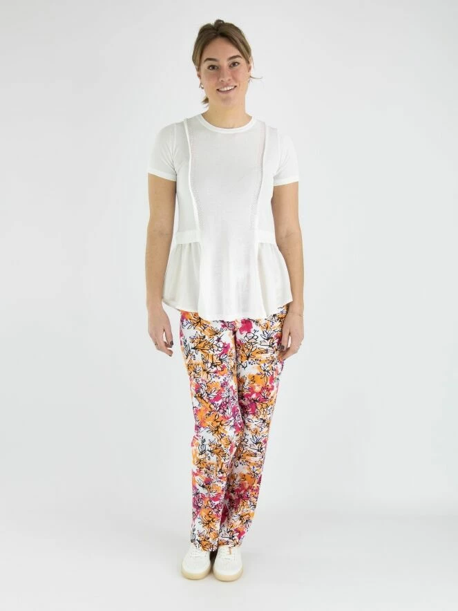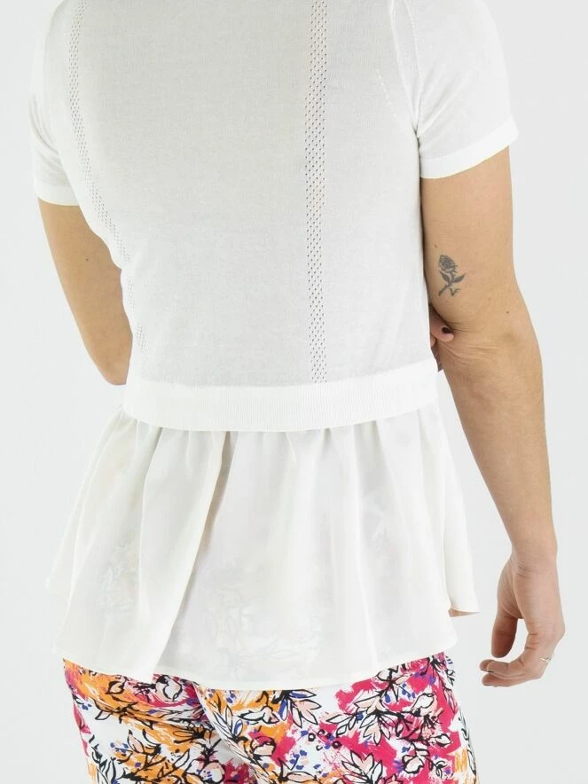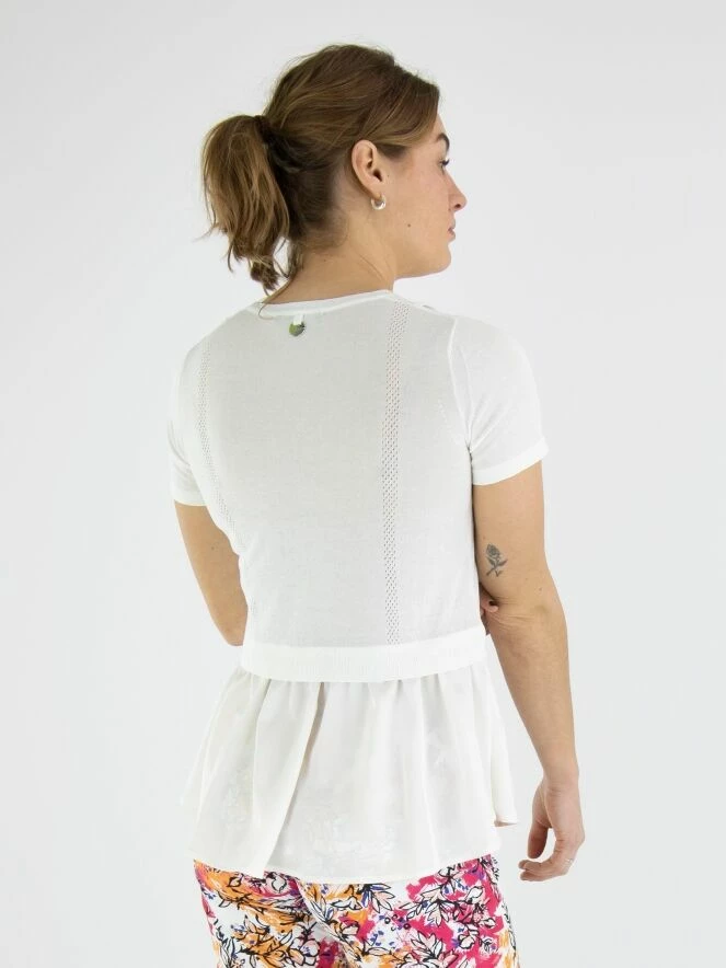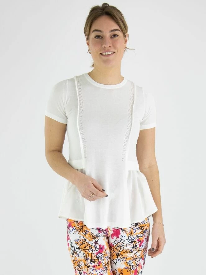 Un chemisier finement tissé de High en blanc crème. À gauche et à droite du centre, il y a une bordure ajourée, avec une bordure en tricot finement côtelée à côté sur le devant. À partir de la taille, les côtés se prolongent vers l’arrière avec un tissu en satin mat. Le chemisier a des manches courtes et peut être lavé à la main.