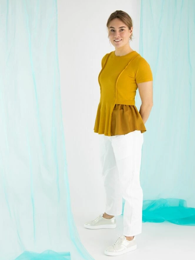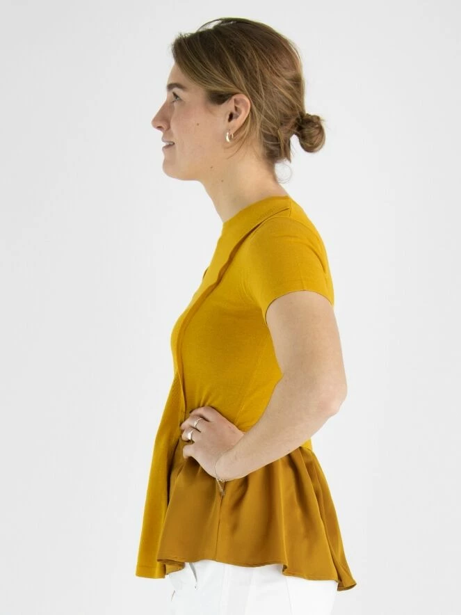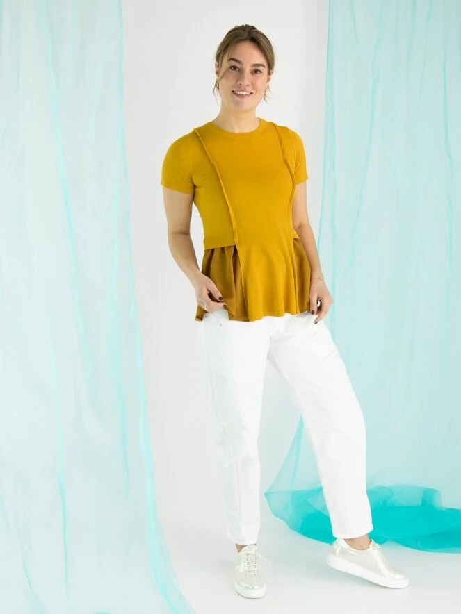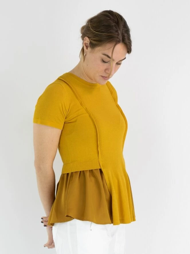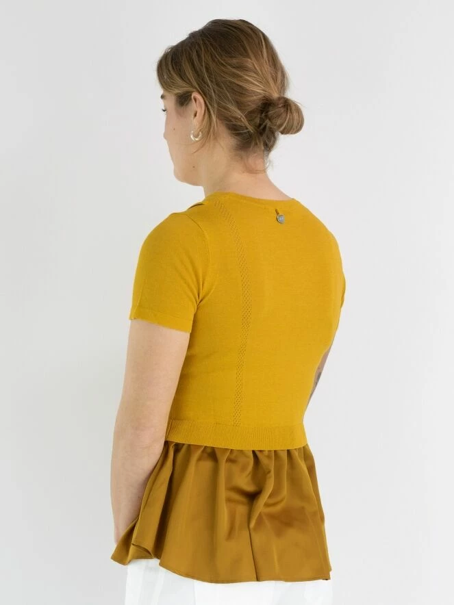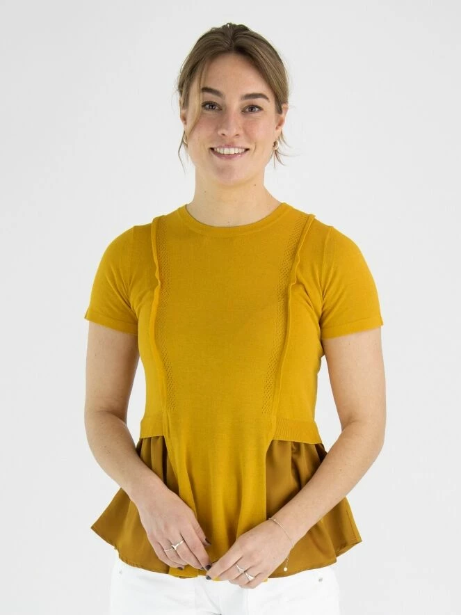 Un chemisier finement tissé de High en jaune ocre. À gauche et à droite du centre, il y a une bordure ajourée, avec une bordure en tricot finement côtelée à côté sur le devant. À partir de la taille, les côtés se prolongent vers l’arrière avec un tissu en satin mat. Le chemisier a des manches courtes et peut être lavé à la main.