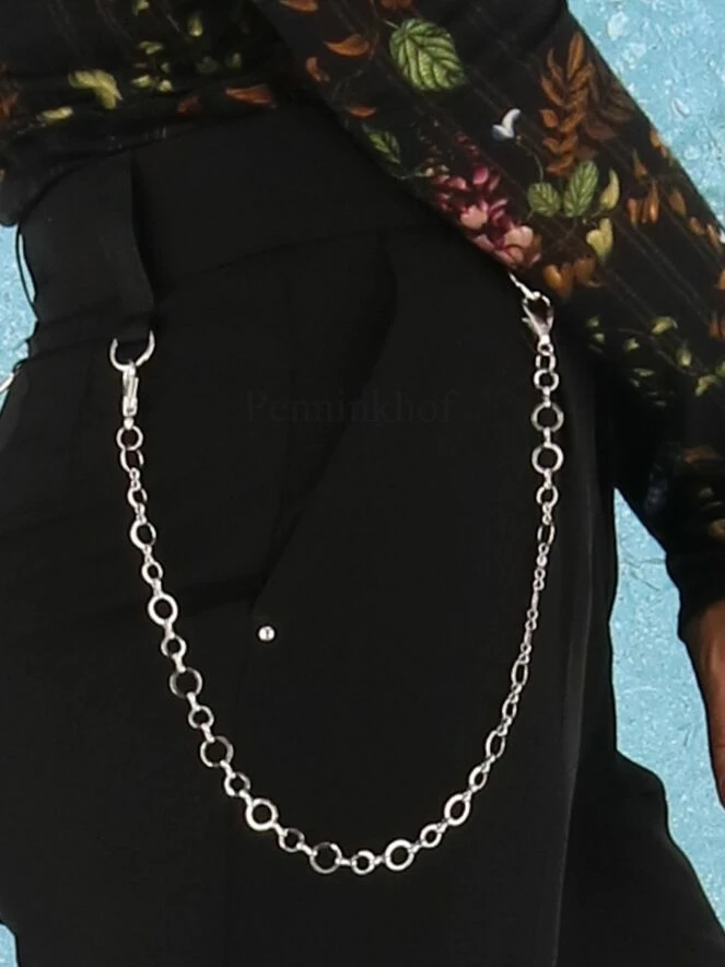 Pantalon à la coupe droite de la marque High, de couleur noire. Un pli simple part de la taille jusqu’au bas du pantalon où un revers orne la cheville. Le pantalon est équipé de poches latérales et d’une chainette amovible argentée. Lavage à 30 degrés.