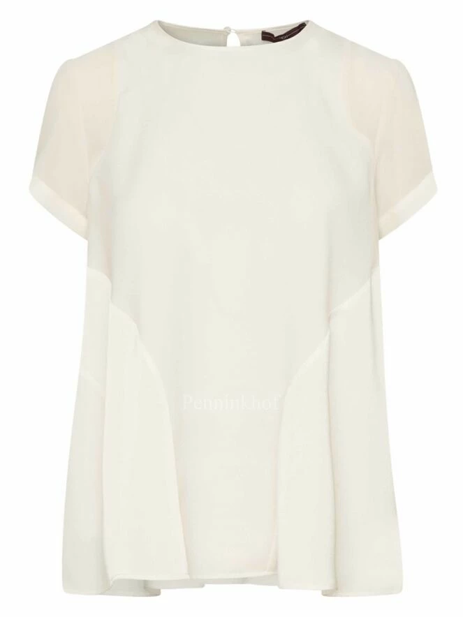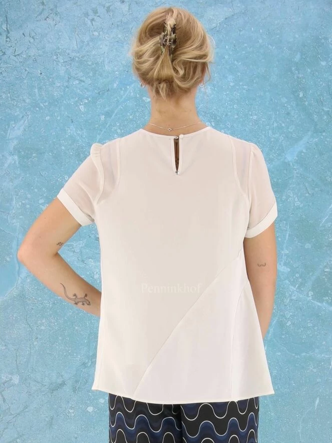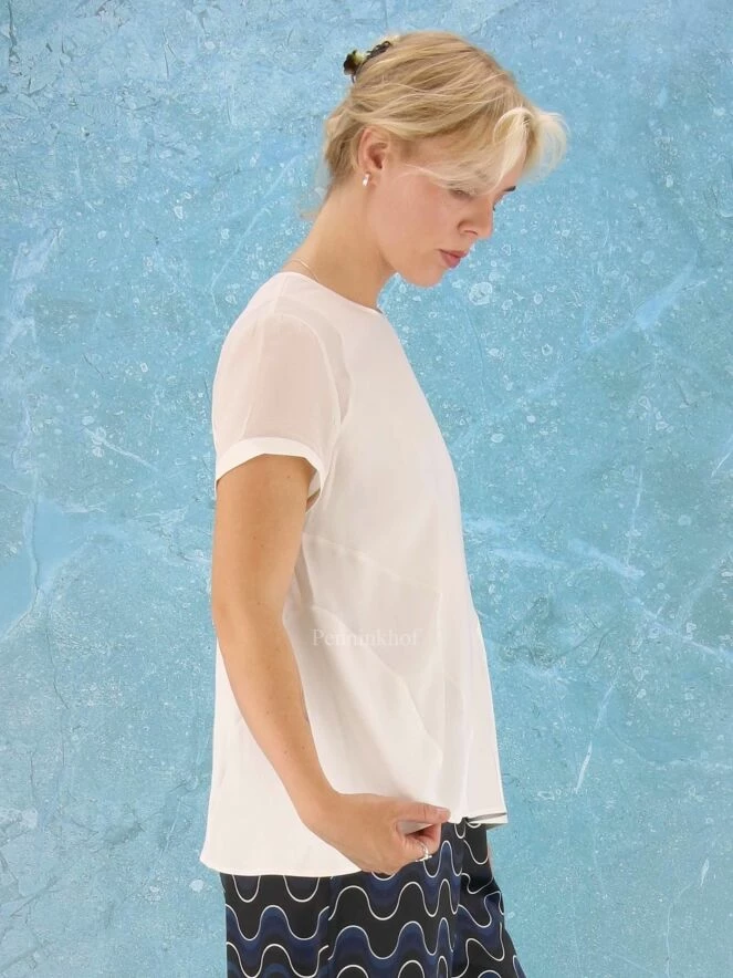 Chemise à manches courtes de la marque High, à deux nuances d’écru dans un tissu satiné mat. Les manches courtes sont légèrement transparentes. La chemise présente une coupe en ligne A. Lavage à la main.