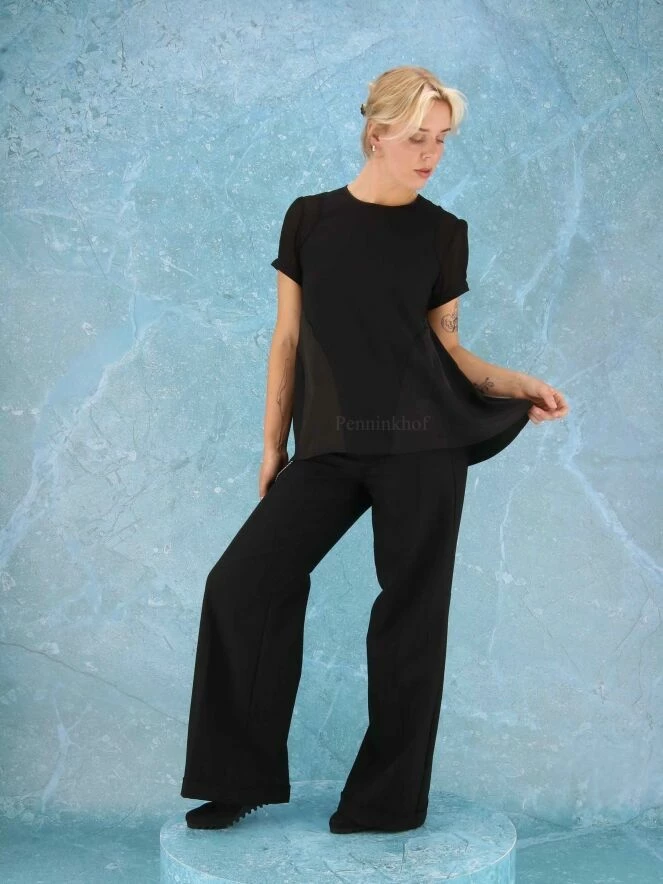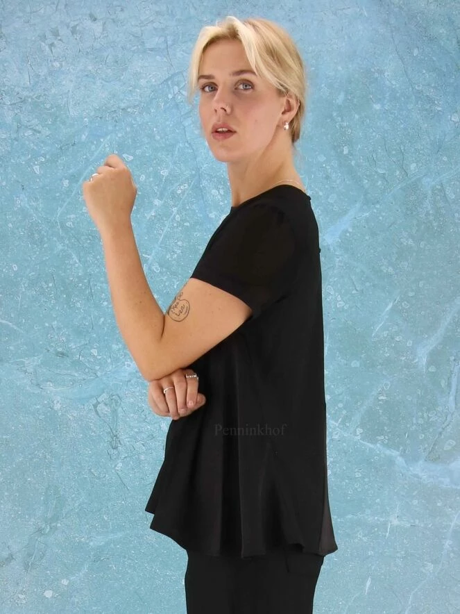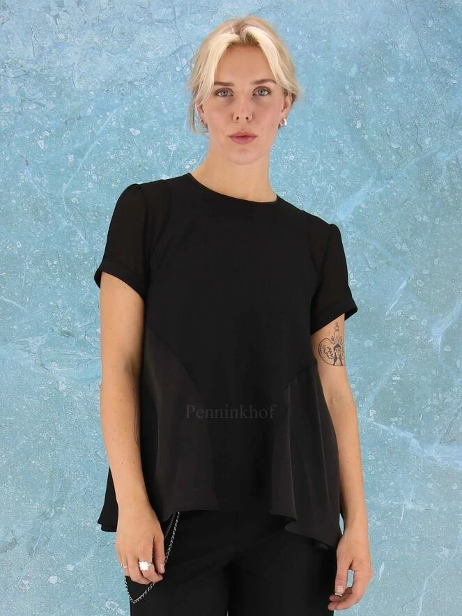 Chemise à manches courtes de la marque High, à deux nuances de noir dans un tissu satiné mat. Les manches courtes sont légèrement transparentes. La chemise présente une coupe en ligne A. Lavage à la main.