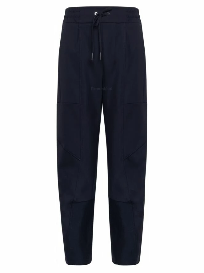 Pantalon de jogging de la marque High, de couleur bleu marine. La taille est équipée d’une bande élastique finement froncée avec un cordon de serrage sous tunnel. Le pantalon présente des coutures horizontales et diagonales. Un clou décoratif orne l’entrée des poches latérales. Lavage à la main.