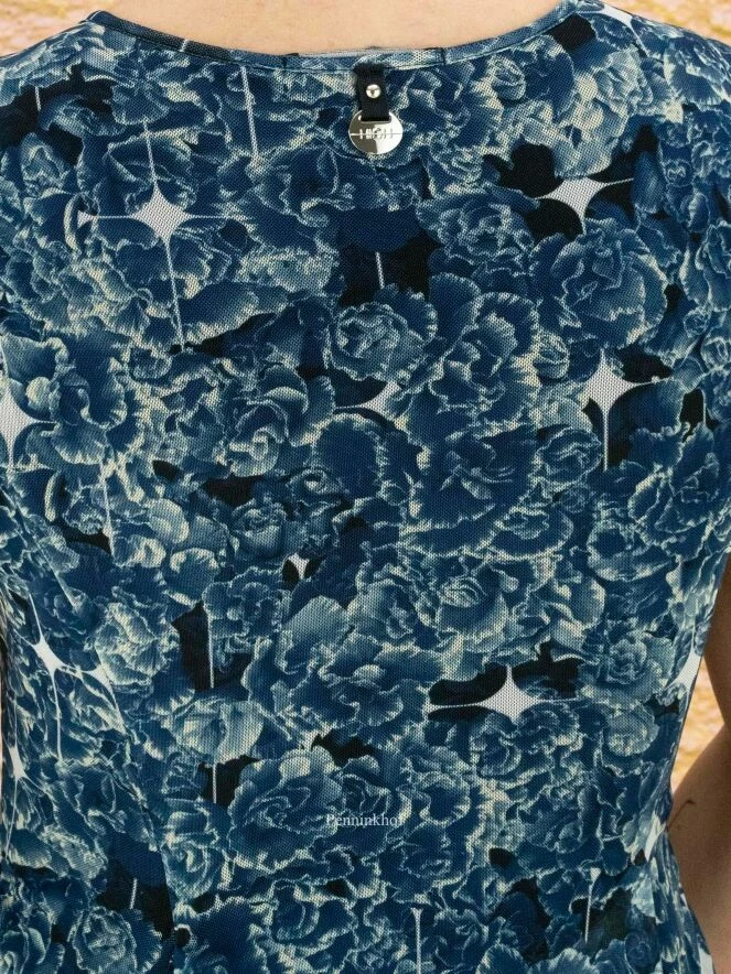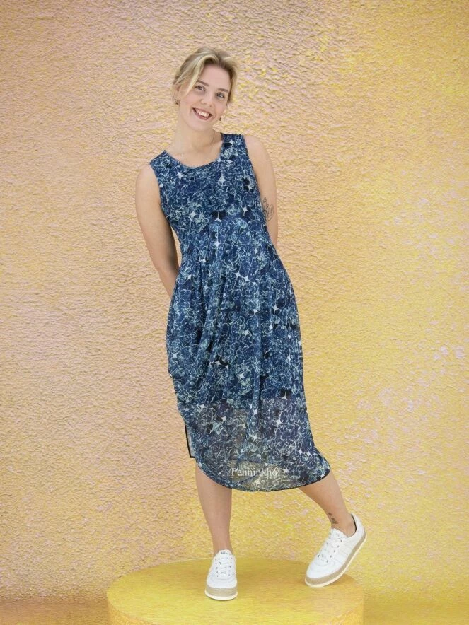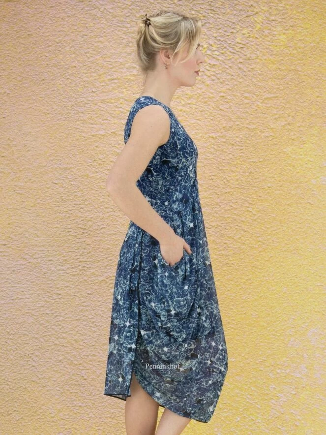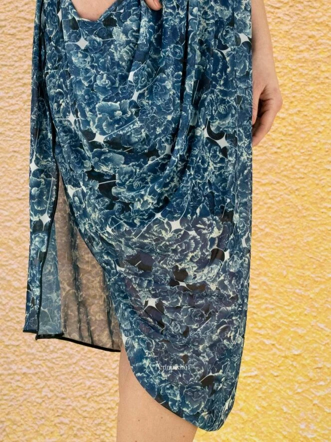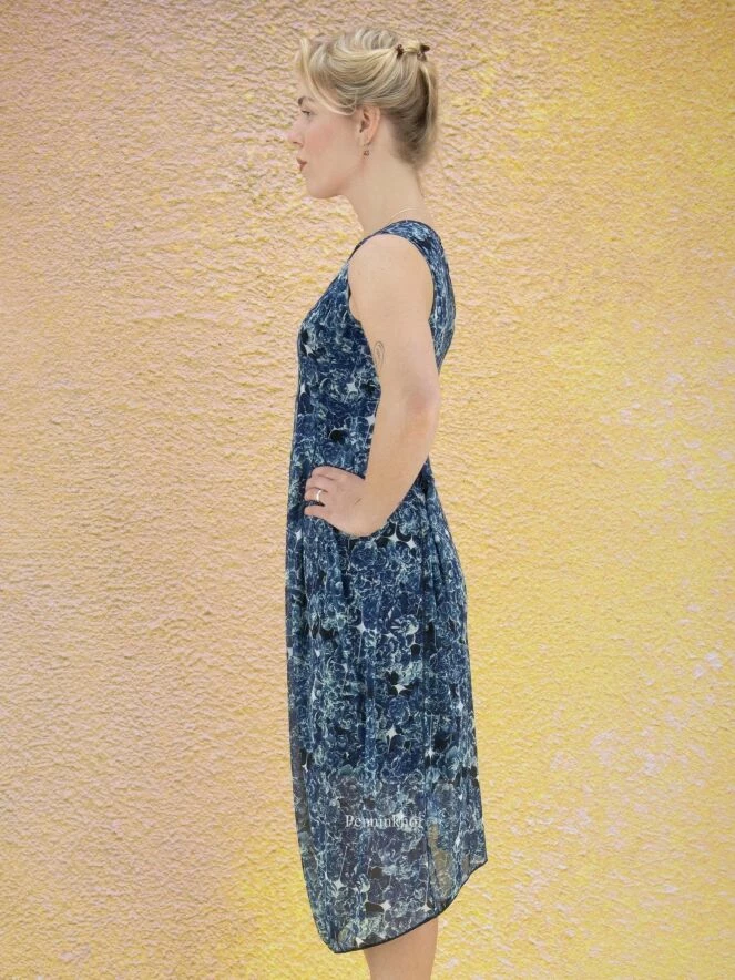 Robe sans manches semi transparente de la marque High, à imprimé floral aux multiples nuances de bleu et de blanc crème. L’encolure ronde est large. La robe est dotée de poches latérales. Le corsage moulant à reprises multiples s’ouvre au niveau de la taille haute, donnant du volume et créant un drapé. La robe est doublée. Lavage à la main.