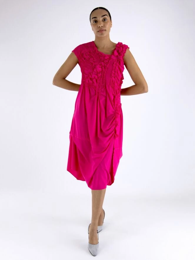 Une robe de High en couleur fuchsia. La robe présente des fronces dans deux structures différentes à partir de la taille, ce qui est joliment mis en valeur sur les épaules gauche et droite. Sur le côté gauche, le long d’une couture, le tissu est froncé de manière à créer un effet de drapé. Cette robe peut être lavée à la main.