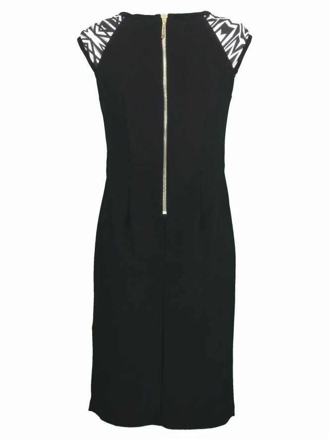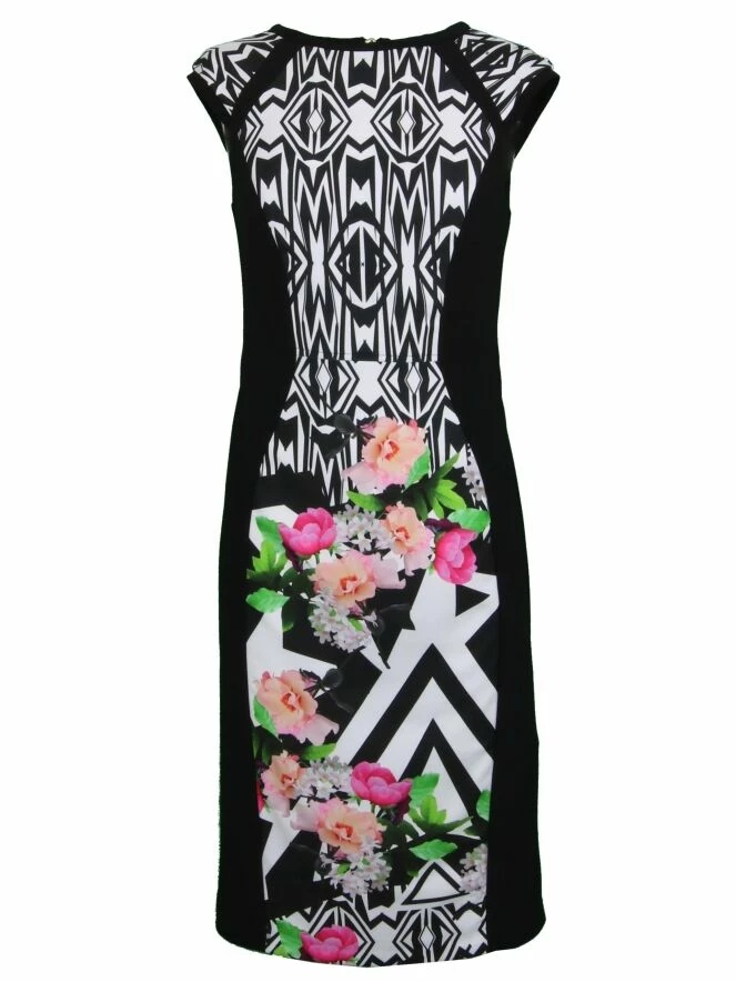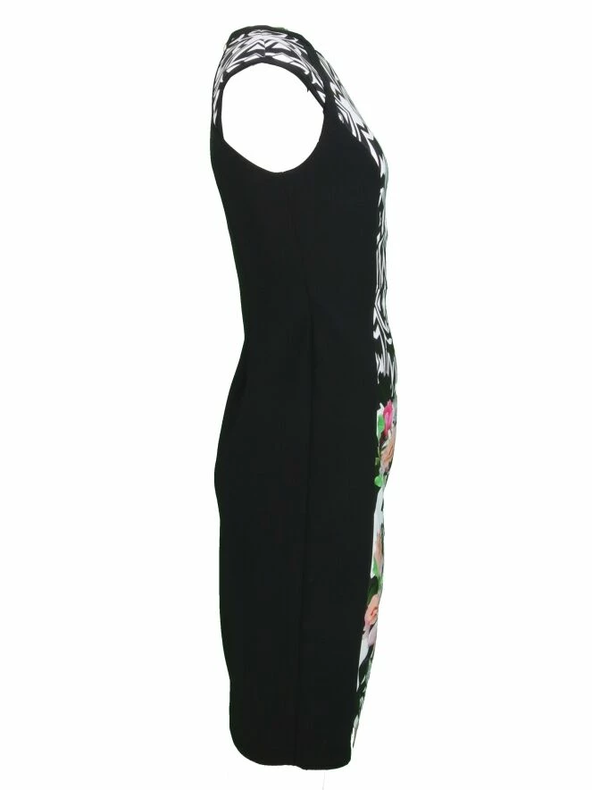 Robe sans manches de la marque Joseph Ribkoff, de couleur noire avec un imprimé géométrique noir et blanc sur tout l’avant de la robe, superposé d’un imprimé floral très coloré vers le bas. L’imprimé géométrique remonte jusqu’à l’arrière des épaules. Dans le dos, une fermeture Eclair descend jusqu’au milieu de la robe. Lavage à la main.