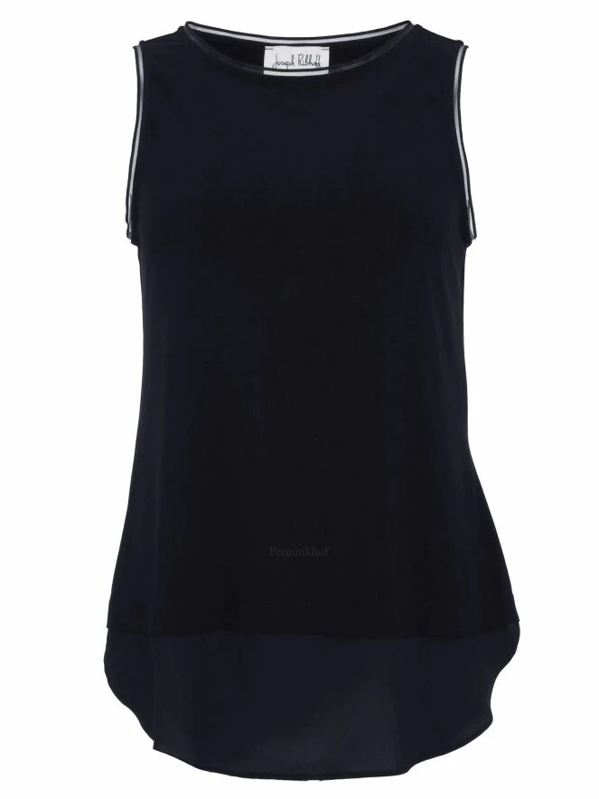 Top long sans manches, de la marque Joseph Ribkoff, de couleur bleu marine. Le bas est fait d’une large bande de tissu noir transparent légèrement virevoltant. Le col rond et les larges emmanchures sont ornés de passepoils en voile transparent. Lavage à la main.