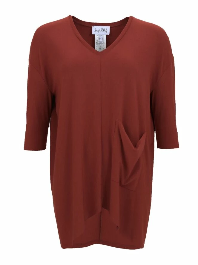 Tee-shirt long et large de la marque Joseph Ribkoff, de couleur brun rouille. Il présente des manches courtes et un col en V. Une poche très ouverte orne l’avant gauche à hauteur de la taille. Lavage à la main.